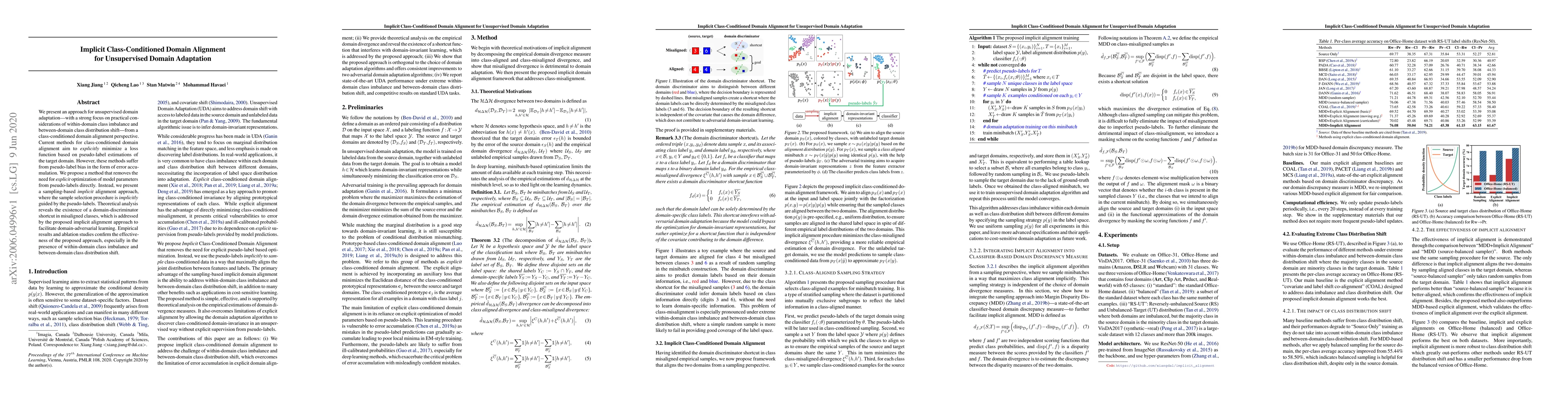 We present an approach for unsupervised domain adaptation---with a strong focus on practical considerations of within-domain class imbalance and between-domain class distribution shift---from a class-conditioned domain alignment perspective. Current methods for class-conditioned domain alignment aim to explicitly minimize a loss function based on pseudo-label estimations of the target domain. However, these methods suffer from pseudo-label bias in the form of error accumulation. We propose a method that removes the need for explicit optimization of model parameters from pseudo-labels directly. Instead, we present a sampling-based implicit alignment approach, where the sample selection procedure is implicitly guided by the pseudo-labels. Theoretical analysis reveals the existence of a domain-discriminator shortcut in misaligned classes, which is addressed by the proposed implicit alignment approach to facilitate domain-adversarial learning. Empirical results and ablation studies confirm the effectiveness of the proposed approach, especially in the presence of within-domain class imbalance and between-domain class distribution shift.