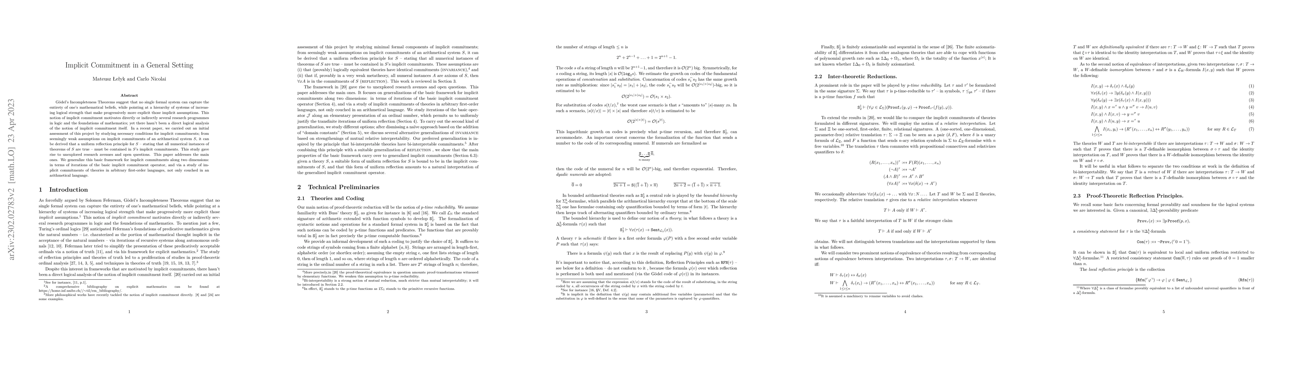 G\"odel's Incompleteness Theorems suggest that no single formal system can capture the entirety of one's mathematical beliefs, while pointing at a hierarchy of systems of increasing logical strength that make progressively more explicit those \emph{implicit} assumptions. This notion of \emph{implicit commitment} motivates directly or indirectly several research programmes in logic and the foundations of mathematics; yet there hasn't been a direct logical analysis of the notion of implicit commitment itself. In a recent paper, \L elyk and Nicolai carried out an initial assessment of this project by studying necessary conditions for implicit commitments; from seemingly weak assumptions on implicit commitments of an arithmetical system $S$, it can be derived that a uniform reflection principle for $S$ -- stating that all numerical instances of theorems of $S$ are true -- must be contained in $S$'s implicit commitments. This study gave rise to unexplored research avenues and open questions. This paper addresses the main ones. We generalize this basic framework for implicit commitments along two dimensions: in terms of iterations of the basic implicit commitment operator, and via a study of implicit commitments of theories in arbitrary first-order languages, not only couched in an arithmetical language.