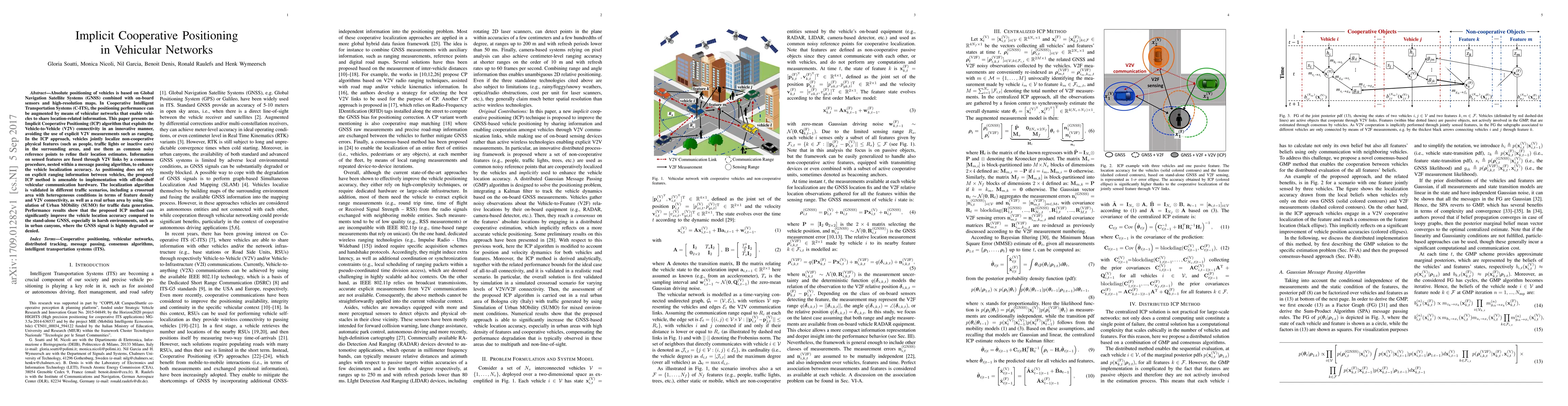 Absolute positioning of vehicles is based on Global Navigation Satellite Systems (GNSS) combined with on-board sensors and high-resolution maps. In Cooperative Intelligent Transportation Systems (C-ITS), the positioning performance can be augmented by means of vehicular networks that enable vehicles to share location-related information. This paper presents an Implicit Cooperative Positioning (ICP) algorithm that exploits the Vehicle-to-Vehicle (V2V) connectivity in an innovative manner, avoiding the use of explicit V2V measurements such as ranging. In the ICP approach, vehicles jointly localize non-cooperative physical features (such as people, traffic lights or inactive cars) in the surrounding areas, and use them as common noisy reference points to refine their location estimates. Information on sensed features are fused through V2V links by a consensus procedure, nested within a message passing algorithm, to enhance the vehicle localization accuracy. As positioning does not rely on explicit ranging information between vehicles, the proposed ICP method is amenable to implementation with off-the-shelf vehicular communication hardware. The localization algorithm is validated in different traffic scenarios, including a crossroad area with heterogeneous conditions in terms of feature density and V2V connectivity, as well as a real urban area by using Simulation of Urban MObility (SUMO) for traffic data generation. Performance results show that the proposed ICP method can significantly improve the vehicle location accuracy compared to the stand-alone GNSS, especially in harsh environments, such as in urban canyons, where the GNSS signal is highly degraded or denied.