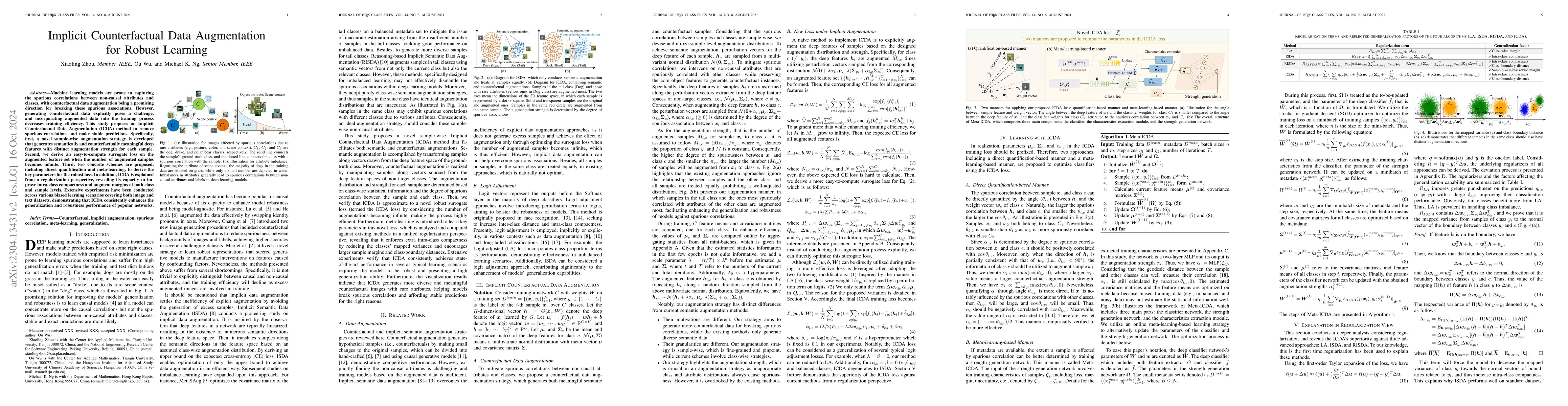 Machine-learning models are prone to capturing the spurious correlations between non-causal attributes and classes, with counterfactual data augmentation being a promising direction for breaking these spurious associations. However, explicitly generating counterfactual data is challenging, with the training efficiency declining. Therefore, this study proposes an implicit counterfactual data augmentation (ICDA) method to remove spurious correlations and make stable predictions. Specifically, first, a novel sample-wise augmentation strategy is developed that generates semantically and counterfactually meaningful deep features with distinct augmentation strength for each sample. Second, we derive an easy-to-compute surrogate loss on the augmented feature set when the number of augmented samples becomes infinite. Third, two concrete schemes are proposed, including direct quantification and meta-learning, to derive the key parameters for the robust loss. In addition, ICDA is explained from a regularization aspect, with extensive experiments indicating that our method consistently improves the generalization performance of popular depth networks on multiple typical learning scenarios that require out-of-distribution generalization.