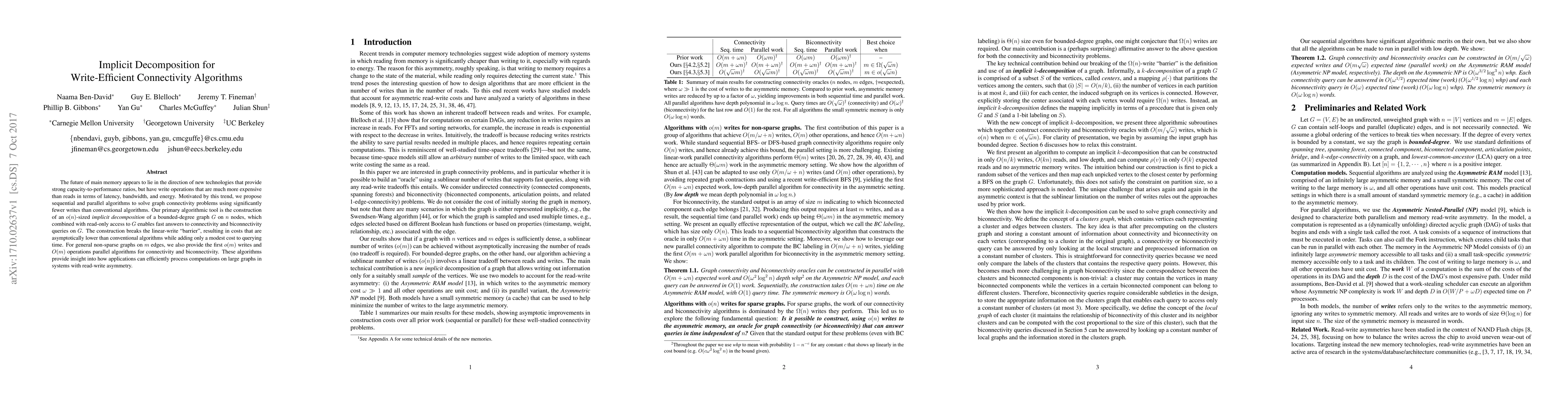 This paper proposes efficient algorithms for graph connectivity problems that significantly reduce write operations, crucial for future memory technologies with expensive writes. It introduces an "implicit decomposition" technique that enables fast connectivity queries with minimal writes, breaking the linear-write barrier for conventional algorithms.