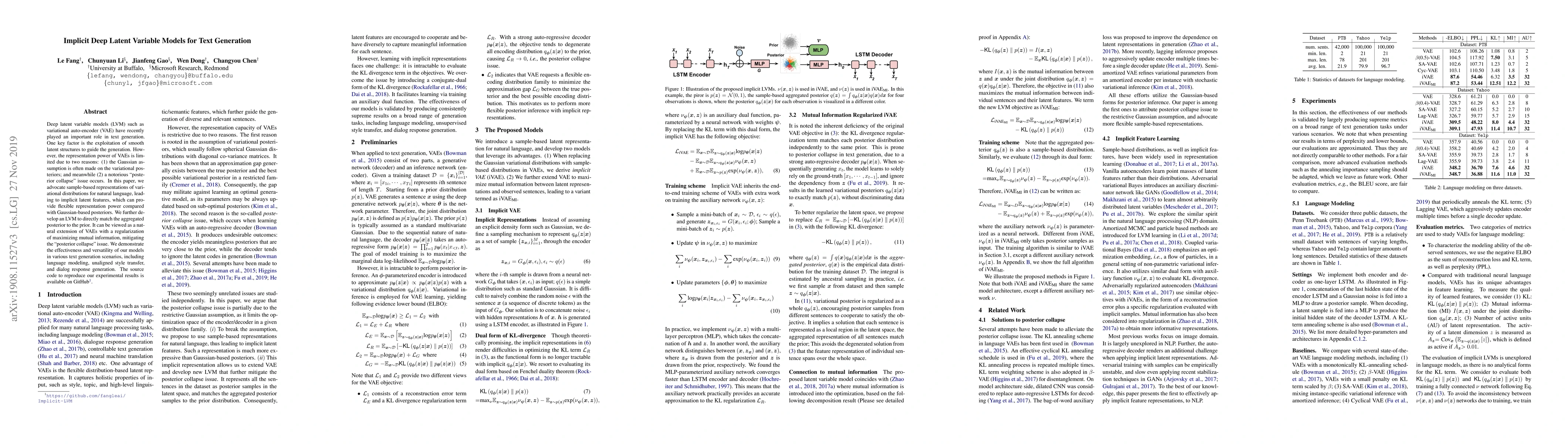 Deep latent variable models (LVM) such as variational auto-encoder (VAE) have recently played an important role in text generation. One key factor is the exploitation of smooth latent structures to guide the generation. However, the representation power of VAEs is limited due to two reasons: (1) the Gaussian assumption is often made on the variational posteriors; and meanwhile (2) a notorious "posterior collapse" issue occurs. In this paper, we advocate sample-based representations of variational distributions for natural language, leading to implicit latent features, which can provide flexible representation power compared with Gaussian-based posteriors. We further develop an LVM to directly match the aggregated posterior to the prior. It can be viewed as a natural extension of VAEs with a regularization of maximizing mutual information, mitigating the "posterior collapse" issue. We demonstrate the effectiveness and versatility of our models in various text generation scenarios, including language modeling, unaligned style transfer, and dialog response generation. The source code to reproduce our experimental results is available on GitHub.