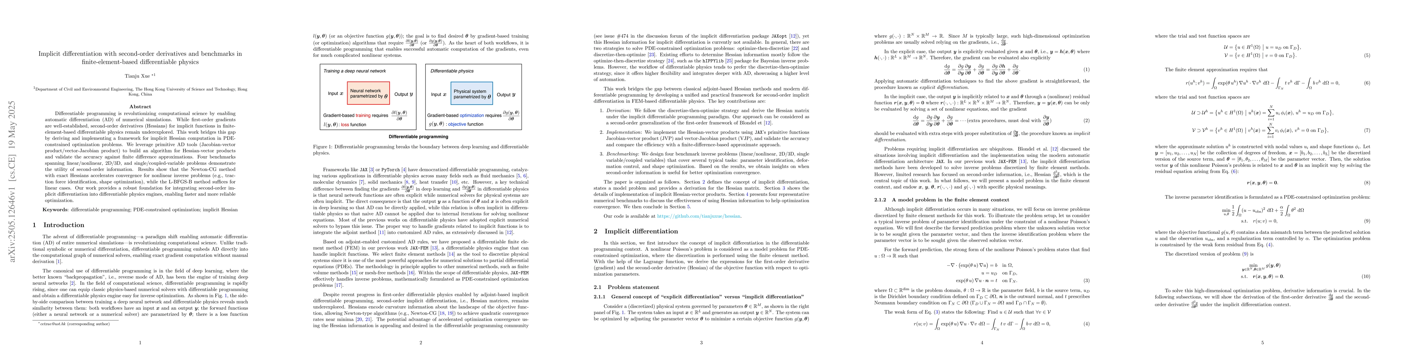 This work is novel in bridging the gap of underexplored second-order derivatives in implicit functions within finite-element methods, providing a practical framework for differentiable programming in computational science.