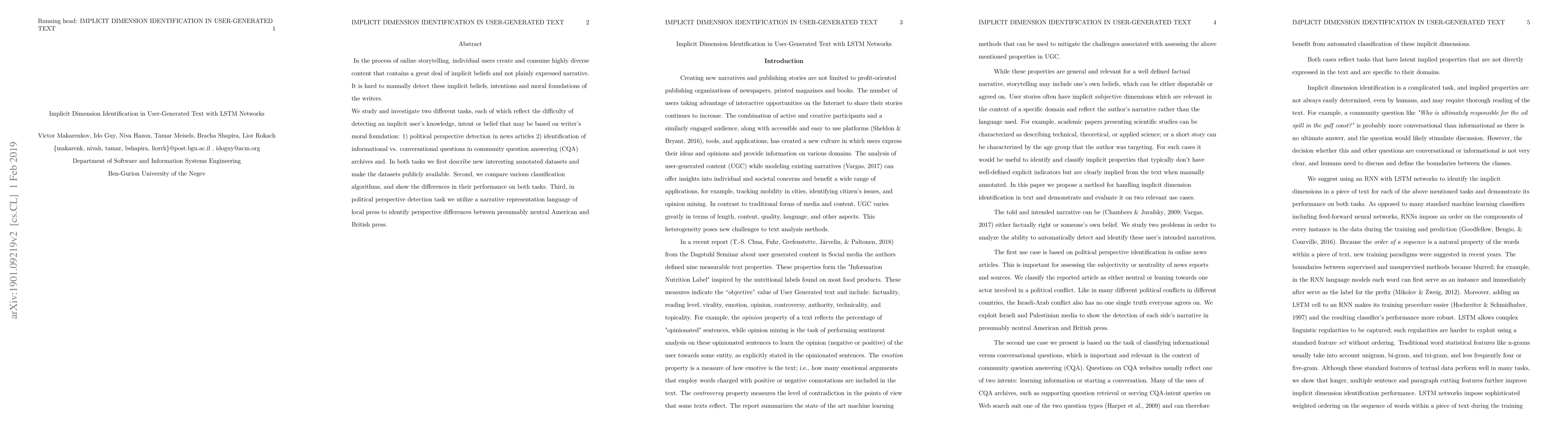In the process of online storytelling, individual users create and consume highly diverse content that contains a great deal of implicit beliefs and not plainly expressed narrative. It is hard to manually detect these implicit beliefs, intentions and moral foundations of the writers. We study and investigate two different tasks, each of which reflect the difficulty of detecting an implicit user's knowledge, intent or belief that may be based on writer's moral foundation: 1) political perspective detection in news articles 2) identification of informational vs. conversational questions in community question answering (CQA) archives and. In both tasks we first describe new interesting annotated datasets and make the datasets publicly available. Second, we compare various classification algorithms, and show the differences in their performance on both tasks. Third, in political perspective detection task we utilize a narrative representation language of local press to identify perspective differences between presumably neutral American and British press.