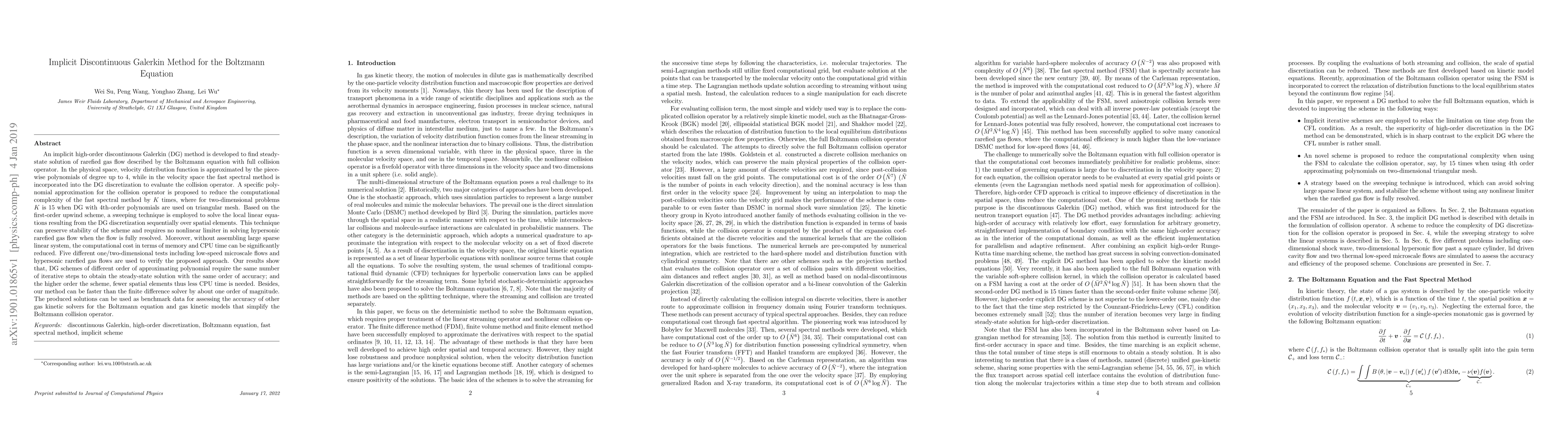 The paper develops an implicit high-order discontinuous Galerkin method for solving the Boltzmann equation, achieving steady-state solutions for rarefied gas flows. The method uses piecewise polynomials for spatial approximation and a fast spectral method for velocity space, significantly reducing computational complexity.