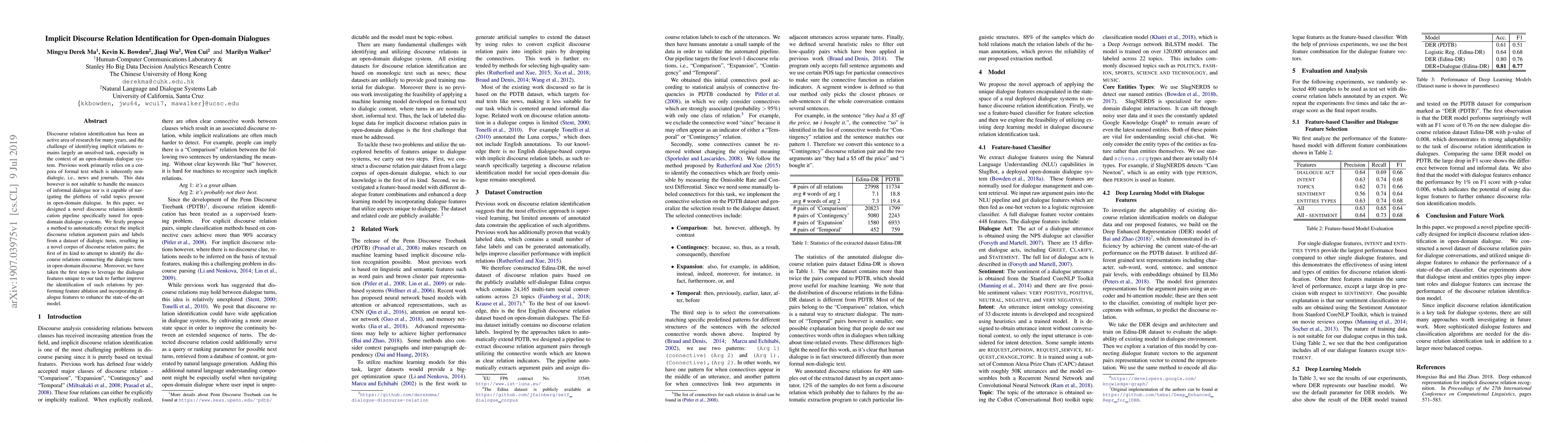 This paper introduces a novel pipeline for identifying implicit discourse relations in open-domain dialogues, addressing the limitations of existing methods using formal text corpora. The authors create a new dataset of discourse relation pairs from dialogic turns and enhance the state-of-the-art model by incorporating unique dialogue features.