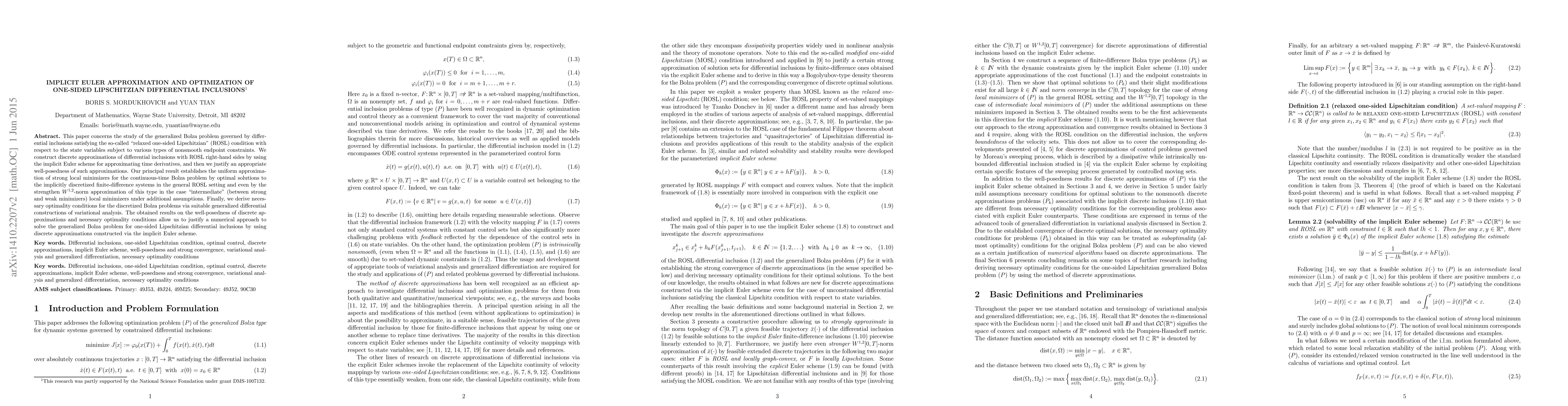 This paper studies the generalized Bolza problem for differential inclusions under relaxed one-sided Lipschitzian conditions, using implicit Euler approximations. It establishes strong approximation of local optimal solutions via discretized systems and derives necessary optimality conditions for numerical solution approaches.
