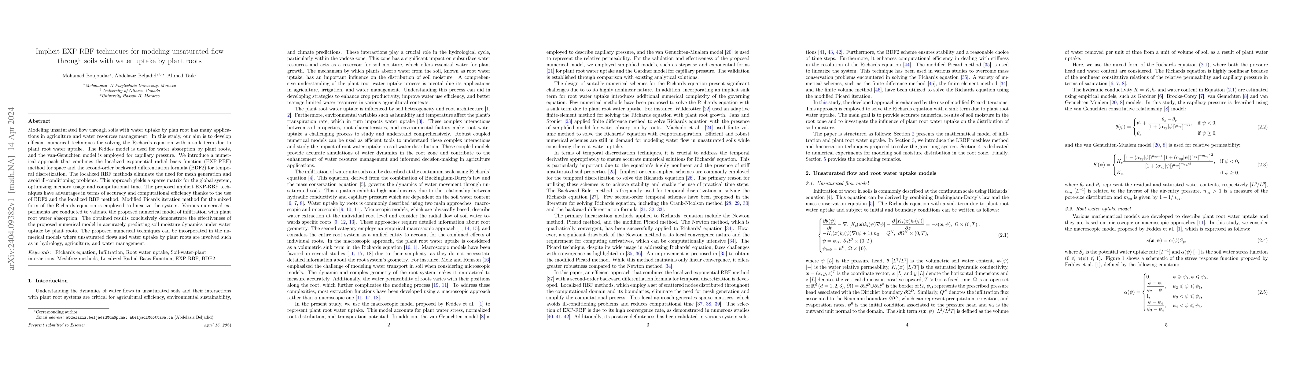 This study develops efficient numerical techniques for modeling unsaturated soil flow with plant root water uptake using an implicit EXP-RBF method and BDF2 for temporal discretization. The localized radial basis functions eliminate mesh generation and improve computational efficiency, while the Feddes and van-Genuchten models account for plant water absorption and capillary pressure, respectively.