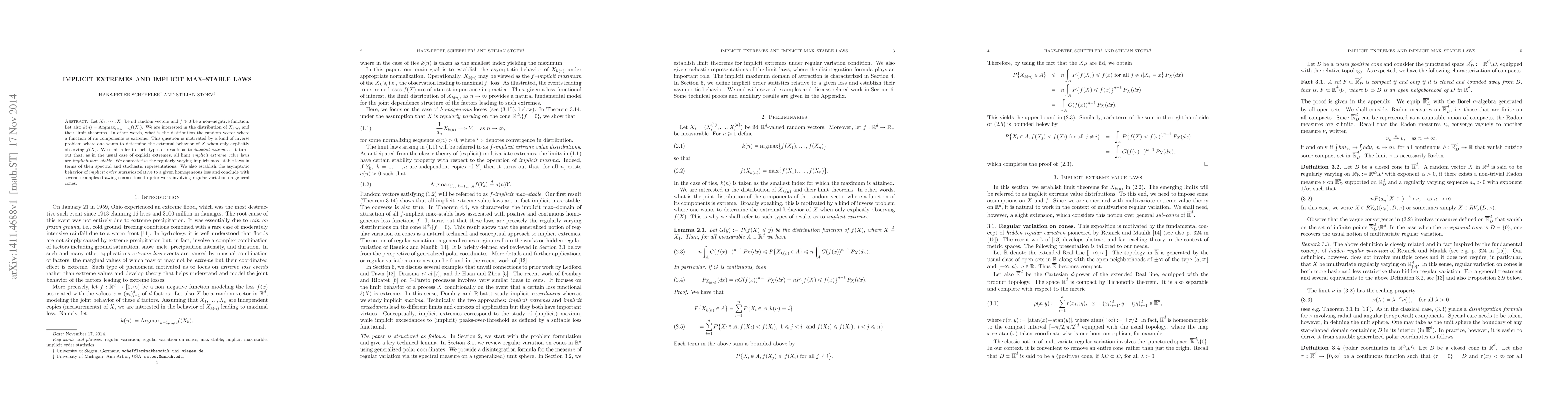 Let $X_1,...,X_n$ be iid random vectors and $f\ge 0$ be a non-negative function. Let also $k(n) = {\rm Argmax}_{i=1,...,n} f(X_i)$. We are interested in the distribution of $X_{k(n)}$ and their limit theorems. In other words, what is the distribution the random vector where a function of its components is extreme? This question is motivated by a kind of inverse problem where one wants to determine the extremal behavior of $X$ when only explicitly observing $f(X)$. We shall refer to such types of results as to implicit extremes. It turns out that, as in the usual case of explicit extremes, all limit implicit extreme value laws are implicit max-stable. We characterize the regularly varying implicit max-stable laws in terms of their spectral and stochastic representations. We also establish the asymptotic behavior of implicit order statistics relative to a given homogeneous loss and conclude with several examples drawing connections to prior work involving regular variation on general cones.