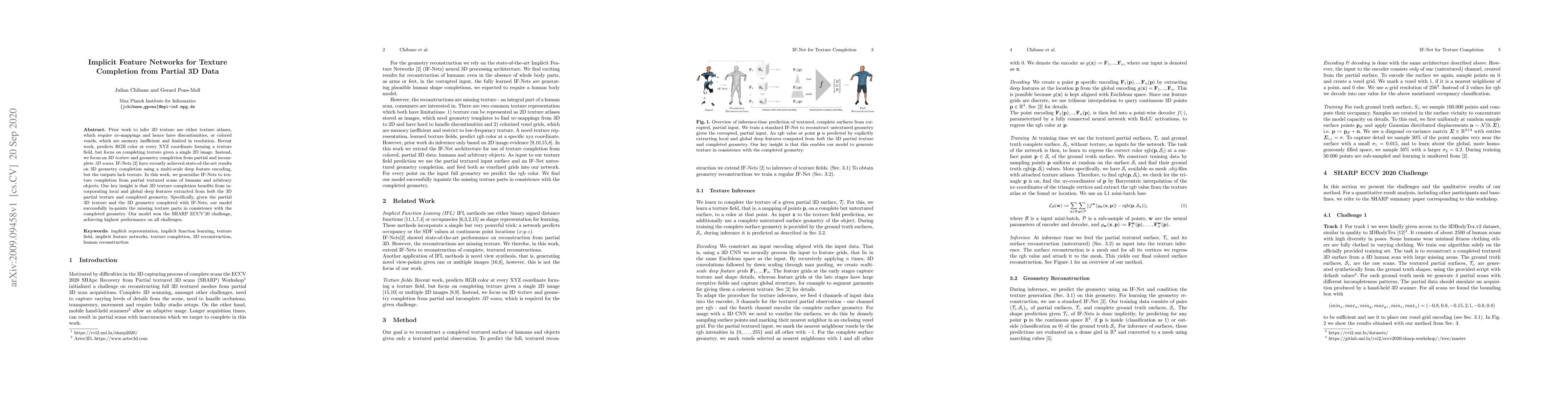 This paper proposes a method to complete 3D texture from partial 3D scans by generalizing Implicit Feature Networks (IF-Nets). The model integrates local and global deep features from both the incomplete texture and completed geometry to achieve consistent texture completion.