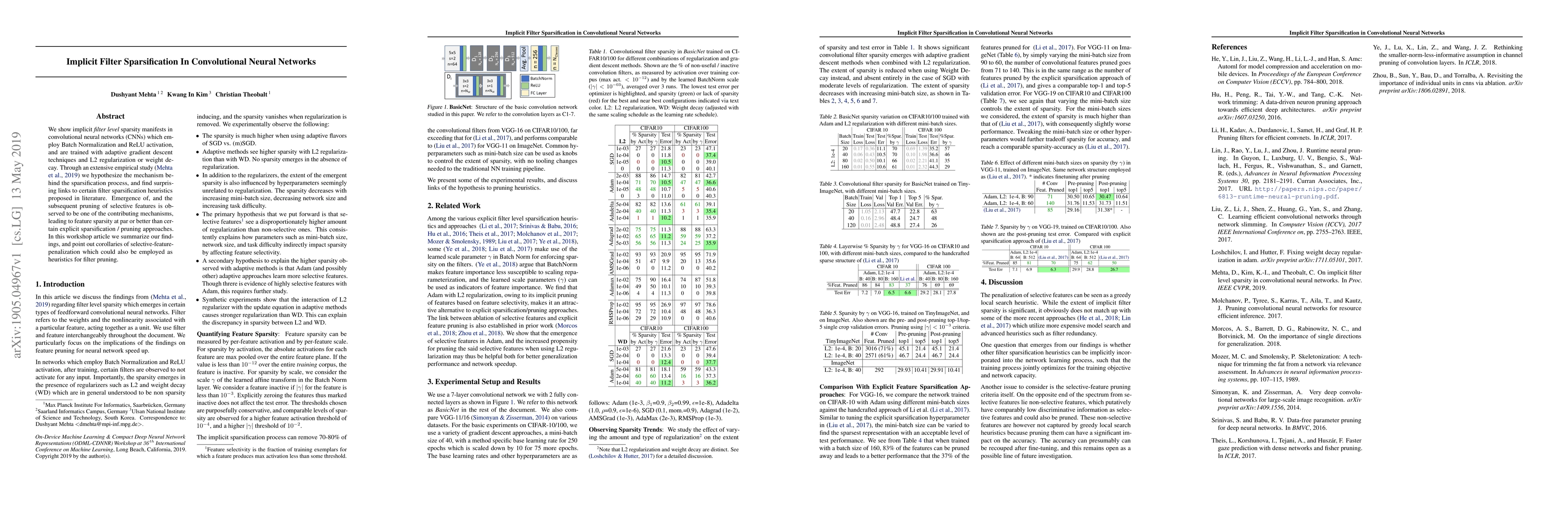 We show implicit filter level sparsity manifests in convolutional neural networks (CNNs) which employ Batch Normalization and ReLU activation, and are trained with adaptive gradient descent techniques and L2 regularization or weight decay. Through an extensive empirical study (Mehta et al., 2019) we hypothesize the mechanism behind the sparsification process, and find surprising links to certain filter sparsification heuristics proposed in literature. Emergence of, and the subsequent pruning of selective features is observed to be one of the contributing mechanisms, leading to feature sparsity at par or better than certain explicit sparsification / pruning approaches. In this workshop article we summarize our findings, and point out corollaries of selective-featurepenalization which could also be employed as heuristics for filter pruning