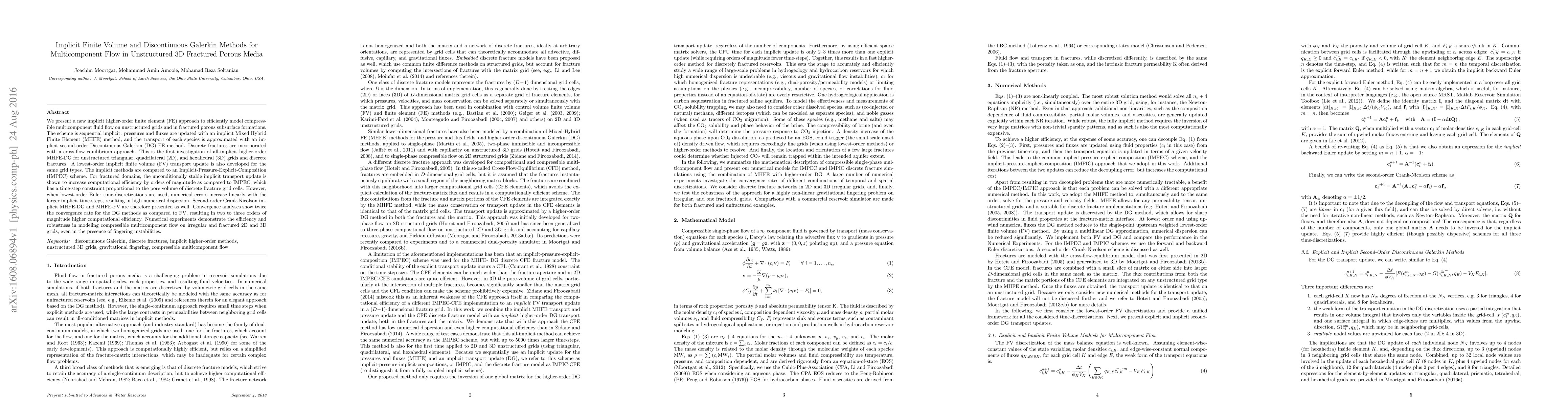 This paper introduces implicit higher-order finite element methods for modeling compressible multicomponent fluid flow in fractured porous media on unstructured grids. The implicit Mixed Hybrid Finite Element and Discontinuous Galerkin methods significantly improve computational efficiency compared to traditional IMPEC schemes, especially for fractured domains.