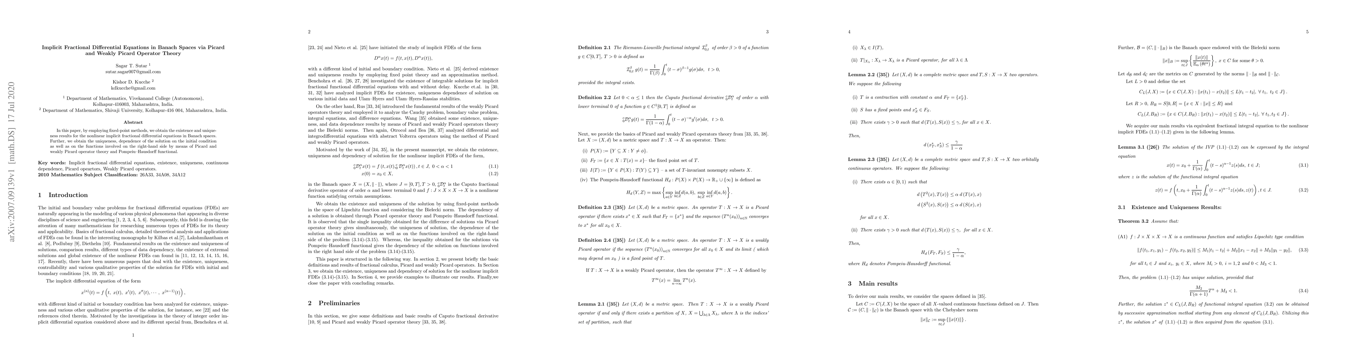 In this paper, by employing fixed-point methods, we obtain the existence and uniqueness results for the nonlinear implicit fractional differential equations in Banach spaces. Further, we obtain the uniqueness, dependence of the solution on the initial condition as well as on the functions involved on the right-hand side by means of Picard and weakly Picard operator theory and Pompeiu--Hausdorff functional.