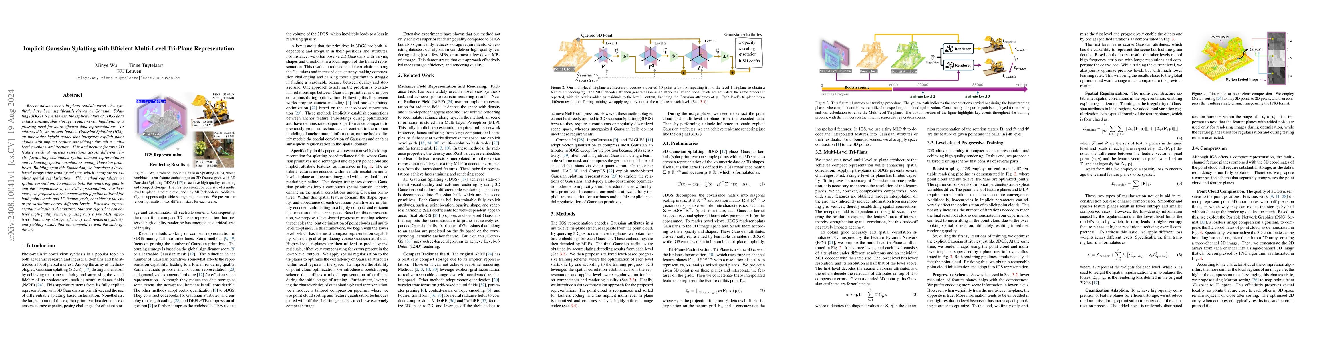 The paper introduces Implicit Gaussian Splatting (IGS), a hybrid model that combines explicit point clouds with implicit feature embeddings through a multi-level tri-plane architecture to achieve efficient data representation. The method employs a progressive training scheme and a tailored compression pipeline to balance storage efficiency and rendering fidelity, delivering high-quality novel view synthesis with minimal storage requirements.