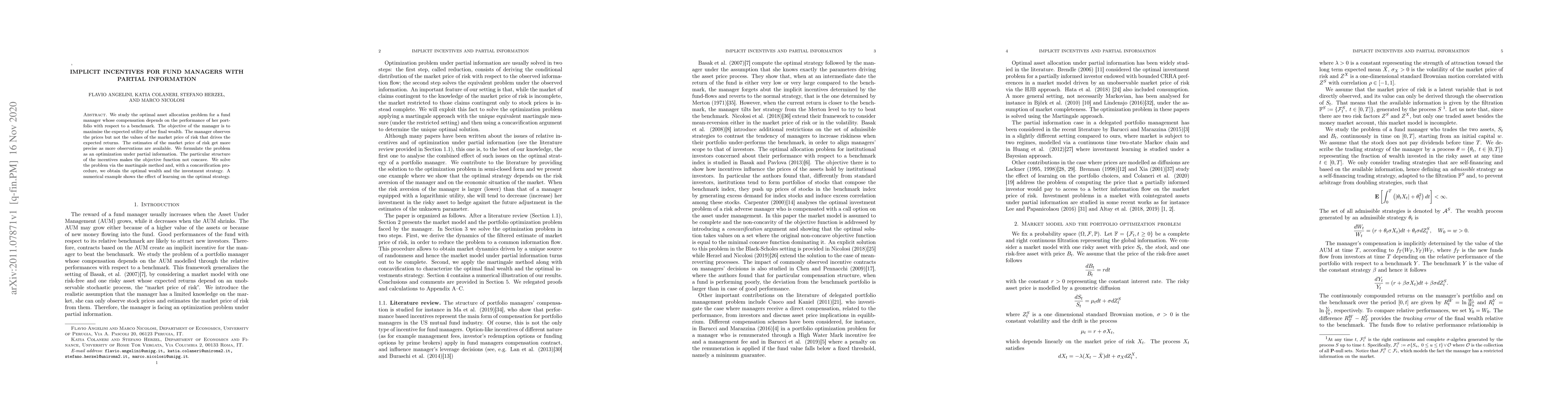 This paper investigates the optimal asset allocation for fund managers under partial information, where compensation depends on portfolio performance relative to a benchmark. Using a martingale approach and concavification, the authors derive the optimal wealth and investment strategy, demonstrating how learning impacts the strategy through a numerical example.