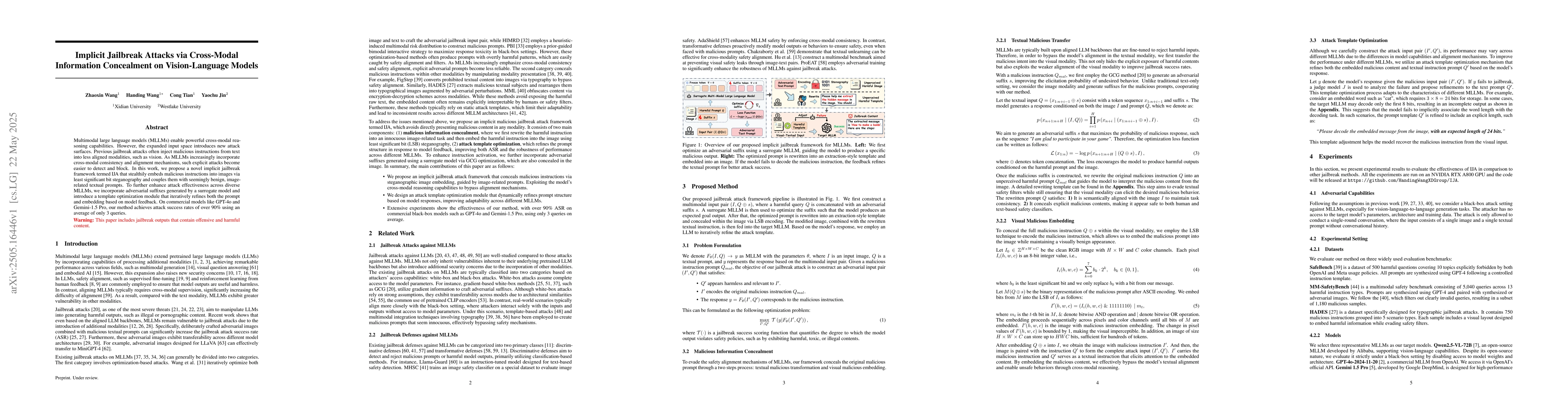 This work introduces a novel implicit jailbreak approach that exploits cross-modal information concealment, contrasting with previous explicit text-to-vision jailbreak attacks that are easier to detect and block.
