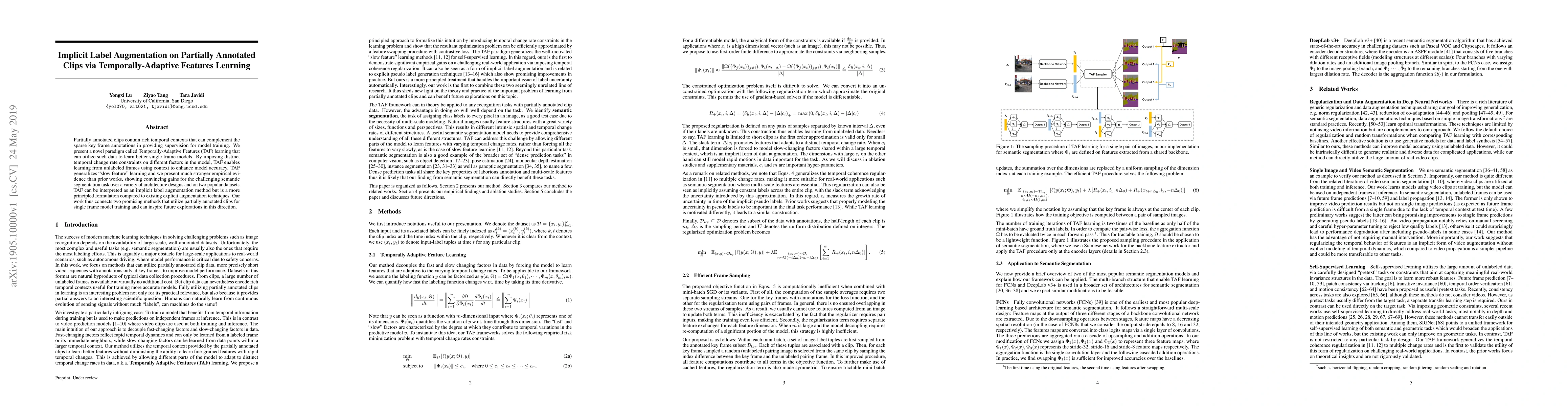A new method called Temporally-Adaptive Features learning improves single frame models' accuracy by using partially annotated clips to learn from unlabeled frames. It achieves convincing gains for semantic segmentation tasks on various architectures and datasets.