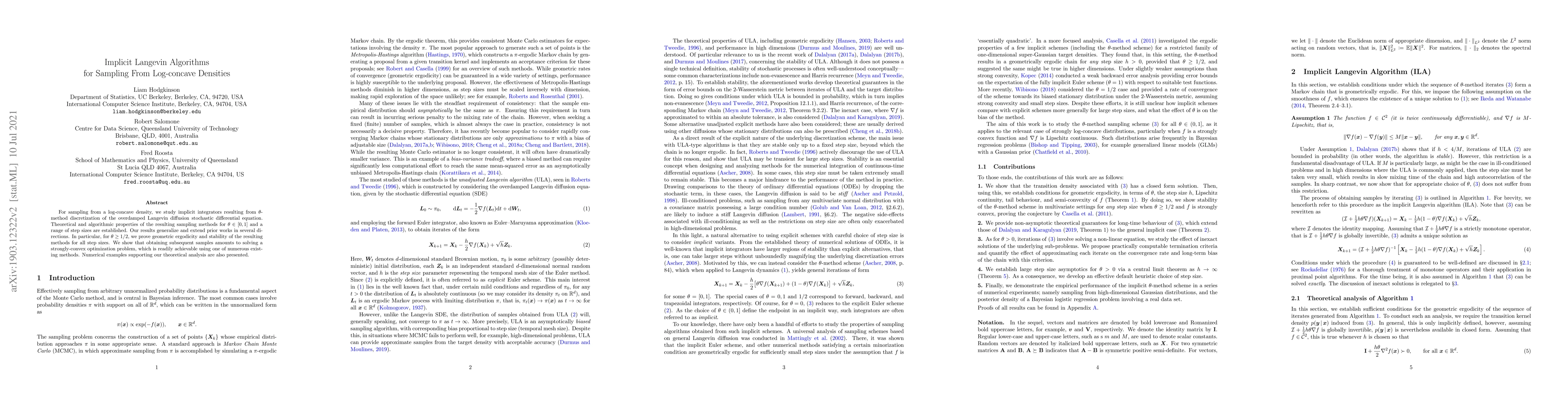 This paper investigates implicit integrators derived from $\theta$-method discretizations of the Langevin diffusion for sampling log-concave densities, proving geometric ergodicity and stability for $\theta\ge1/2$ and establishing their algorithmic properties. It also demonstrates that obtaining samples involves solving a strongly-convex optimization problem, supported by numerical examples.