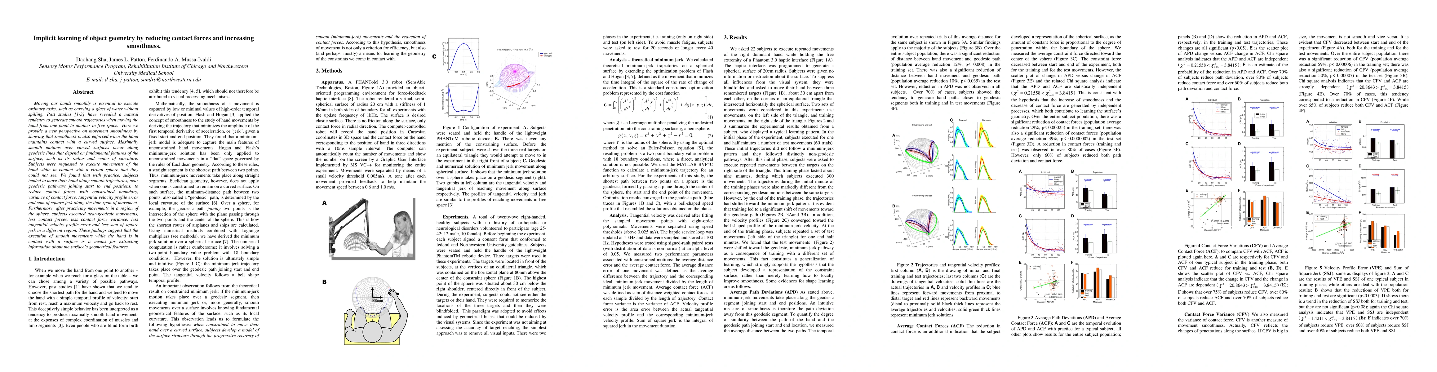 Moving our hands smoothly is essential to execute ordinary tasks, such as carrying a glass of water without spilling. Past studies have revealed a natural tendency to generate smooth trajectories when moving the hand from one point to another in free space. Here we provide a new perspective on movement smoothness by showing that smoothness is also enforced when the hand maintains contact with a curved surface. Maximally smooth motions over curved surfaces occur along geodesic lines that depend on fundamental features of the surface, such as its radius and center of curvature. Subjects were requested to execute movements of the hand while in contact with a virtual sphere that they could not see. We found that with practice, subjects tended to move their hand along smooth trajectories, near geodesic pathways joining start to end positions, to reduce contact forces with constrained boundary, variance of contact force, tangential velocity profile error and sum of square jerk along the time span of movement. Furthermore, after practicing movements in a region of the sphere, subjects executed near-geodesic movements, less contact forces, less contact force variance, less tangential velocity profile error and less sum of square jerk in a different region. These findings suggest that the execution of smooth movements while the hand is in contact with a surface is a means for extracting information about the surface's geometrical features.