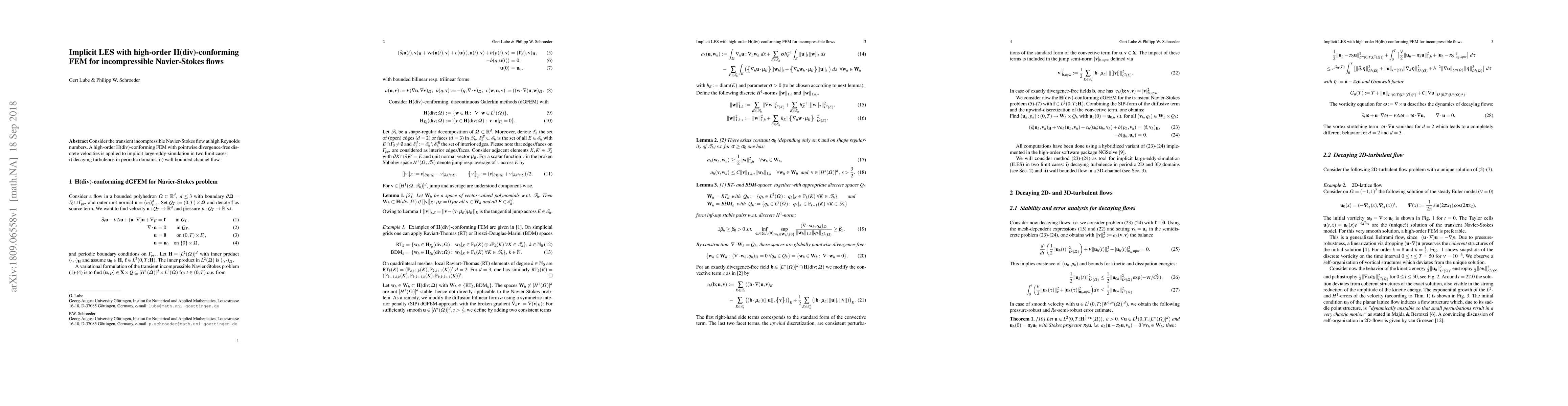 Consider the transient incompressible Navier-Stokes flow at high Reynolds numbers. A high-order H(div)-conforming FEM with pointwise divergence-free dis- crete velocities is applied to implicit large-eddy-simulation in two limit cases: i) decaying turbulence in periodic domains, ii) wall bounded channel flow.