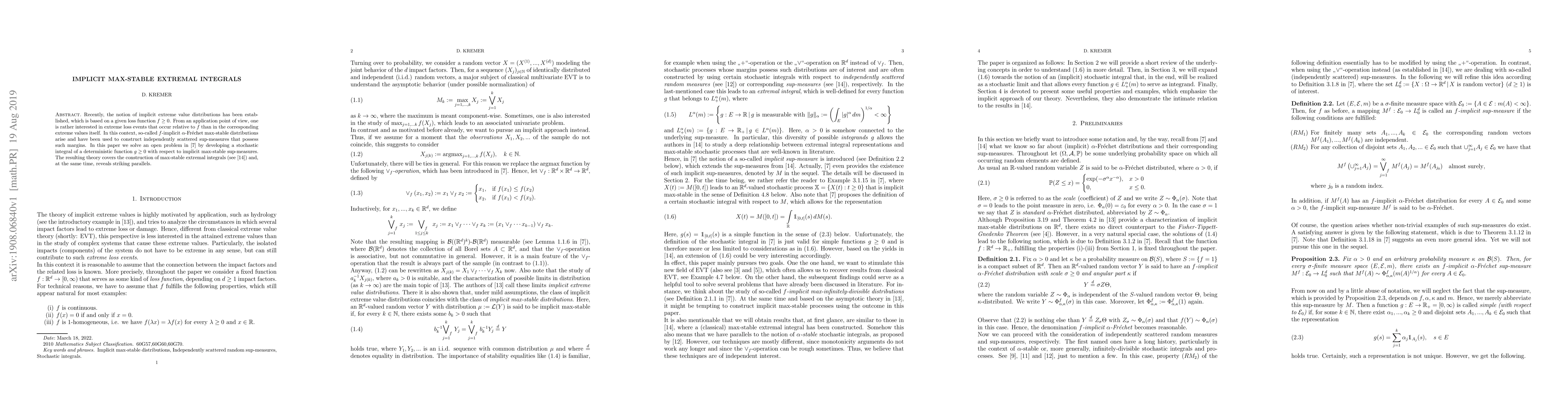 This paper develops a stochastic integral of a deterministic function with respect to implicit max-stable sup-measures, solving an open problem in extremal value theory. The resulting theory constructs max-stable extremal integrals and reveals parallels with existing methods.