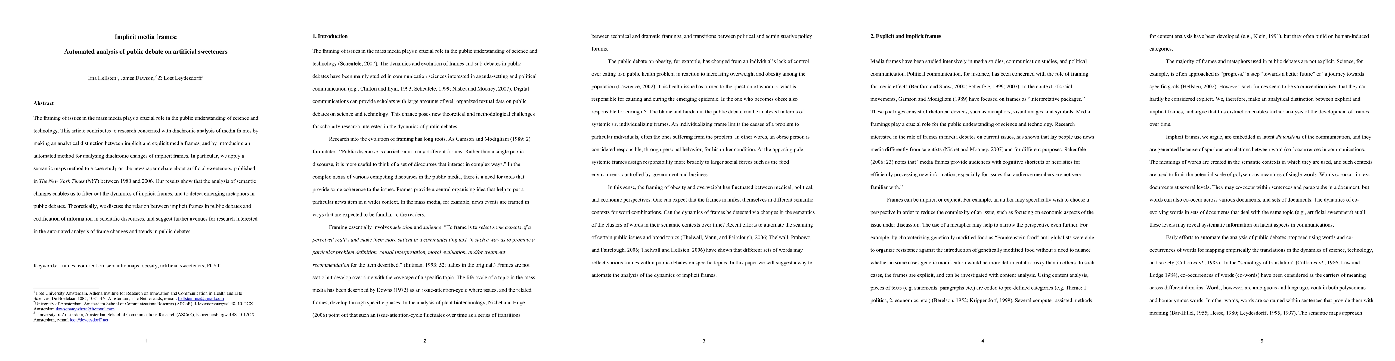 The framing of issues in the mass media plays a crucial role in the public understanding of science and technology. This article contributes to research concerned with diachronic analysis of media frames by making an analytical distinction between implicit and explicit media frames, and by introducing an automated method for analysing diachronic changes of implicit frames. In particular, we apply a semantic maps method to a case study on the newspaper debate about artificial sweeteners, published in The New York Times (NYT) between 1980 and 2006. Our results show that the analysis of semantic changes enables us to filter out the dynamics of implicit frames, and to detect emerging metaphors in public debates. Theoretically, we discuss the relation between implicit frames in public debates and codification of information in scientific discourses, and suggest further avenues for research interested in the automated analysis of frame changes and trends in public debates.