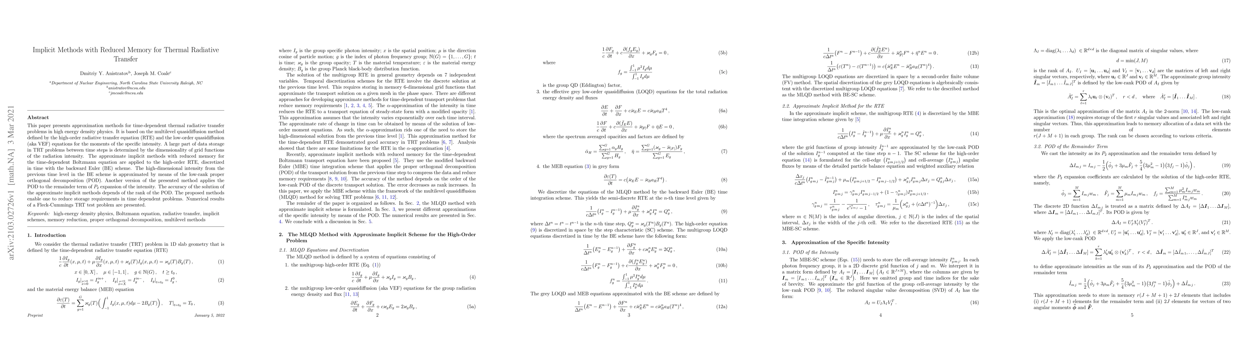 This paper introduces implicit methods for thermal radiative transfer problems that reduce memory usage by employing low-rank proper orthogonal decomposition (POD) to approximate high-dimensional intensity data, demonstrating effective storage reduction and maintaining solution accuracy. Numerical results from a test problem validate the proposed methods.
