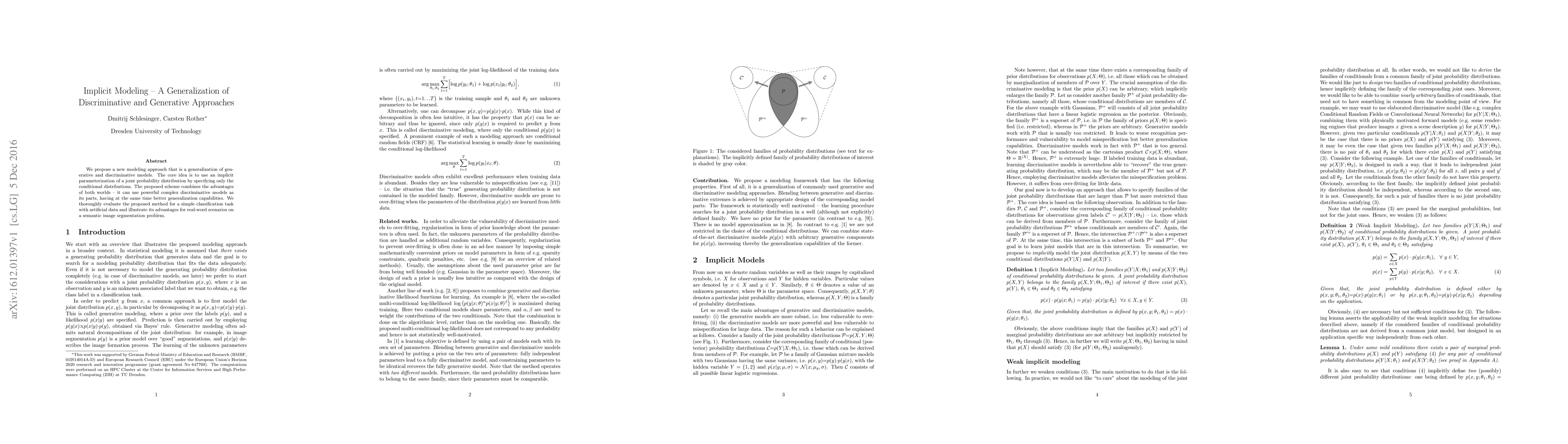 We propose a new modeling approach that is a generalization of generative and discriminative models. The core idea is to use an implicit parameterization of a joint probability distribution by specifying only the conditional distributions. The proposed scheme combines the advantages of both worlds -- it can use powerful complex discriminative models as its parts, having at the same time better generalization capabilities. We thoroughly evaluate the proposed method for a simple classification task with artificial data and illustrate its advantages for real-word scenarios on a semantic image segmentation problem.
