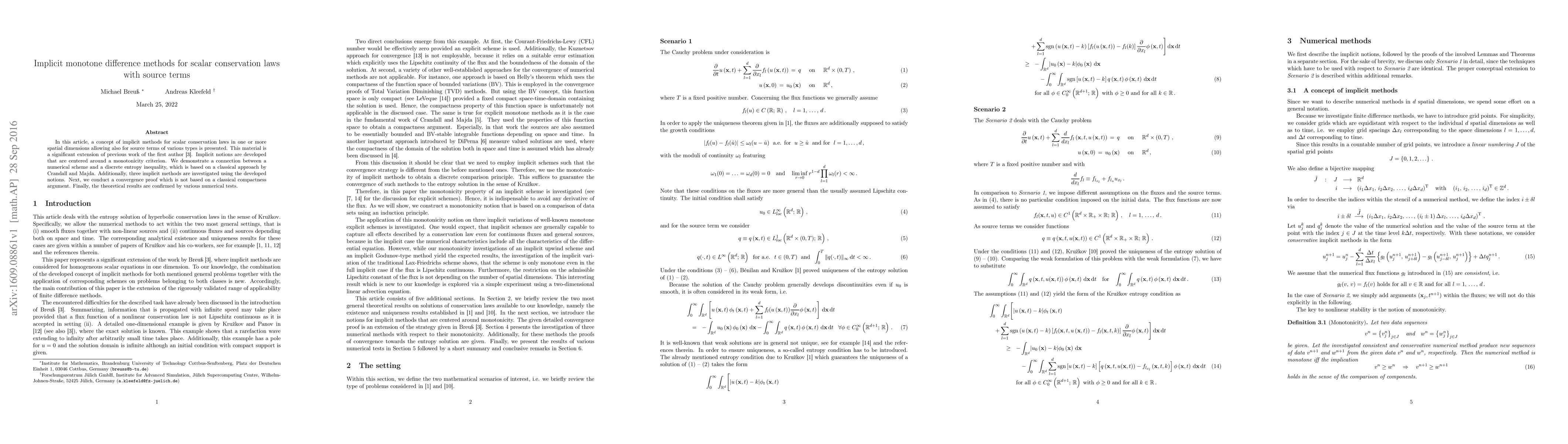 Researchers develop implicit methods for solving scalar conservation laws with source terms, focusing on monotonicity criterion-based approaches and convergence proofs, which are confirmed through numerical tests.