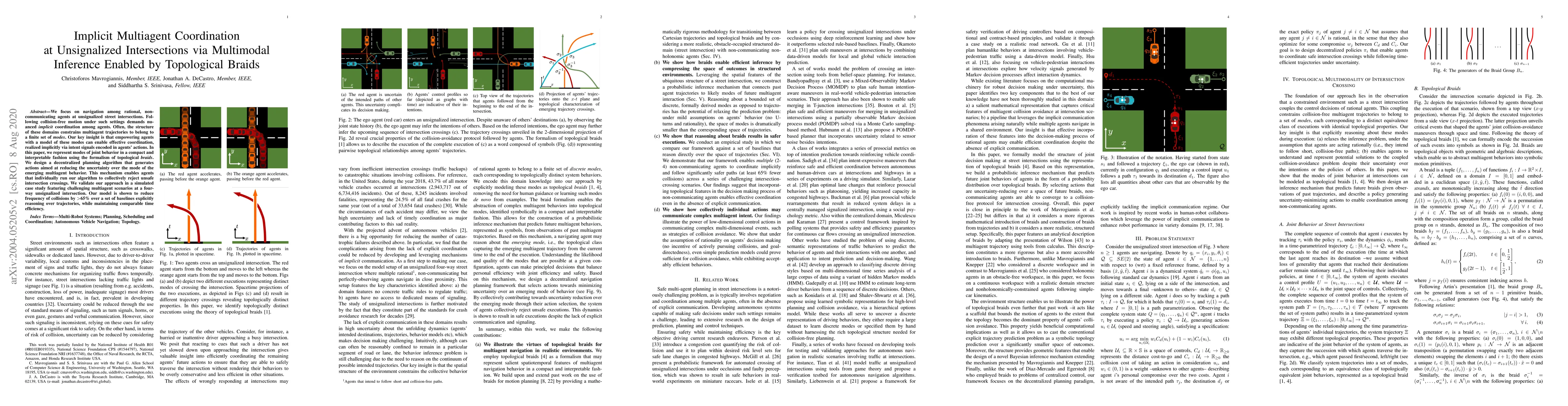 This paper proposes a decentralized planning algorithm using topological braids to implicitly coordinate non-communicating agents at unsignalized intersections, reducing collision frequency by over 65% compared to baselines while maintaining time efficiency. The approach leverages multimodal inference to interpret agents' actions as intent signals.