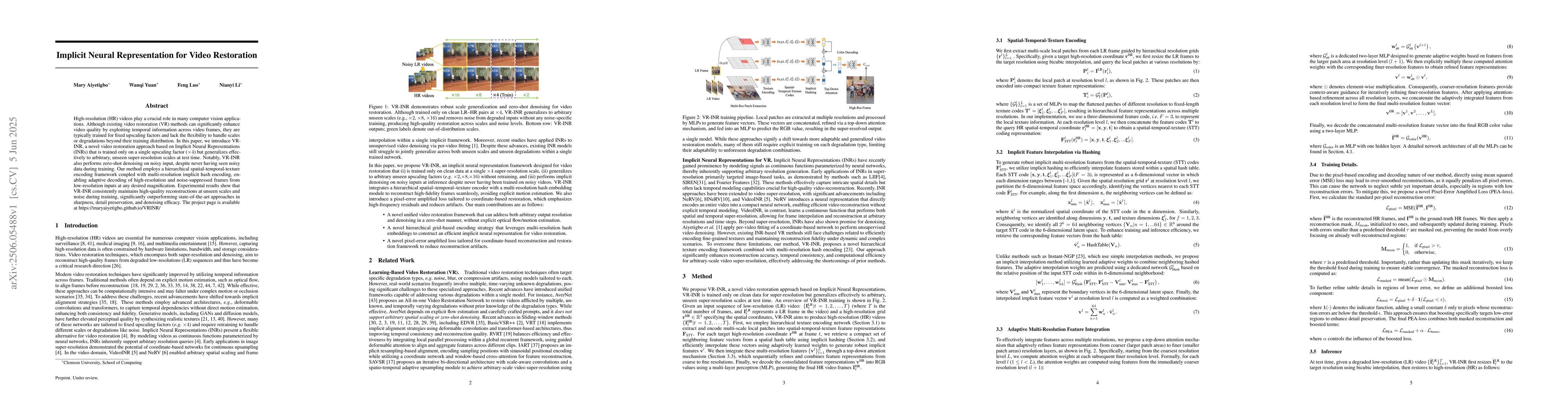 High-resolution (HR) videos play a crucial role in many computer vision applications. Although existing video restoration (VR) methods can significantly enhance video quality by exploiting temporal information across video frames, they are typically trained for fixed upscaling factors and lack the flexibility to handle scales or degradations beyond their training distribution. In this paper, we introduce VR-INR, a novel video restoration approach based on Implicit Neural Representations (INRs) that is trained only on a single upscaling factor ($\times 4$) but generalizes effectively to arbitrary, unseen super-resolution scales at test time. Notably, VR-INR also performs zero-shot denoising on noisy input, despite never having seen noisy data during training. Our method employs a hierarchical spatial-temporal-texture encoding framework coupled with multi-resolution implicit hash encoding, enabling adaptive decoding of high-resolution and noise-suppressed frames from low-resolution inputs at any desired magnification. Experimental results show that VR-INR consistently maintains high-quality reconstructions at unseen scales and noise during training, significantly outperforming state-of-the-art approaches in sharpness, detail preservation, and denoising efficacy.