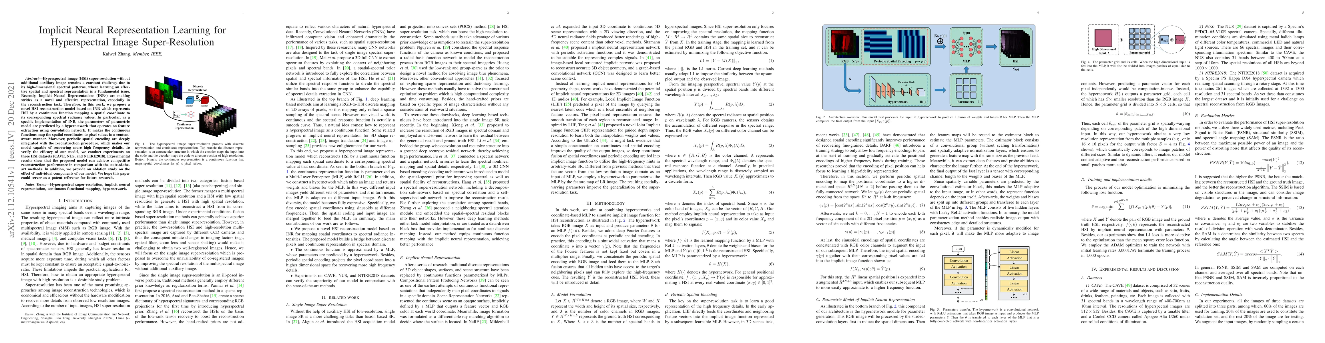 This paper proposes a novel hyperspectral image (HSI) super-resolution model based on Implicit Neural Representations (INRs), which uses a hypernetwork to predict the parameters of a continuous function mapping spatial coordinates to spectral radiance values. The model integrates periodic spatial encoding to recover high-frequency details, achieving competitive reconstruction performance compared to state-of-the-art methods.