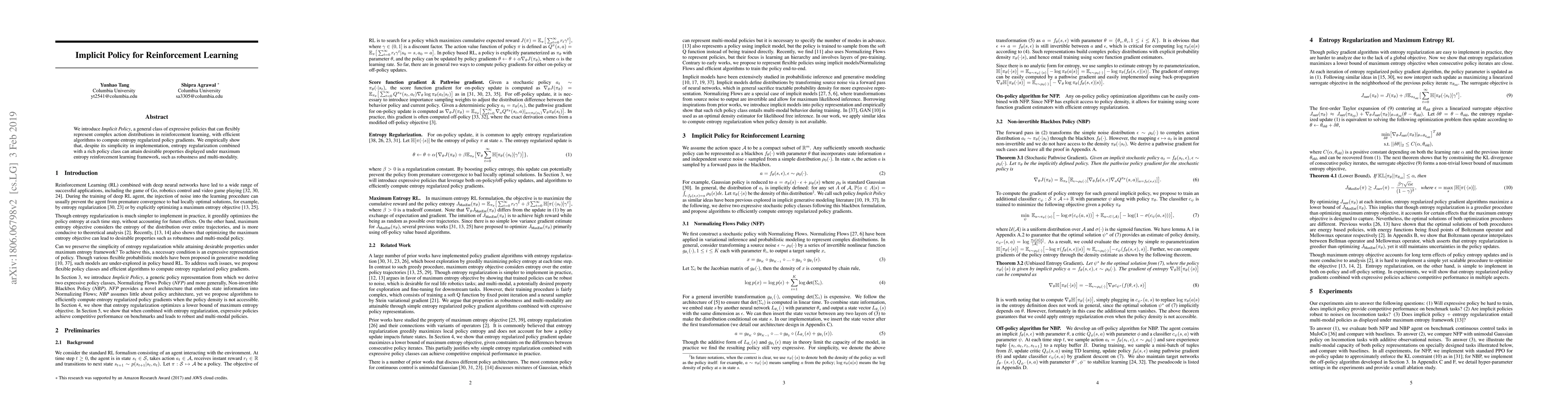 This paper introduces Implicit Policy, a versatile reinforcement learning approach that efficiently represents complex action distributions. It demonstrates that entropy regularization with this policy class achieves robustness and multi-modality, akin to maximum entropy reinforcement learning.