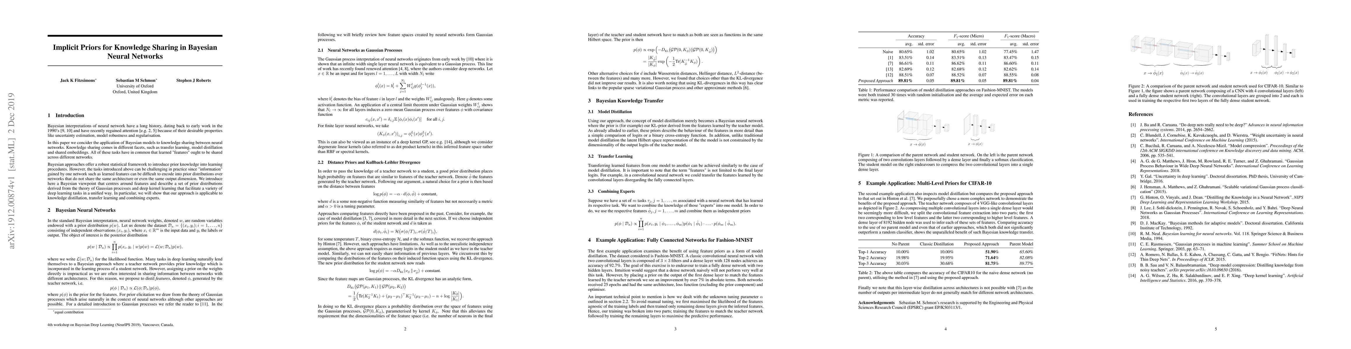Bayesian interpretations of neural network have a long history, dating back to early work in the 1990's and have recently regained attention because of their desirable properties like uncertainty estimation, model robustness and regularisation. We want to discuss here the application of Bayesian models to knowledge sharing between neural networks. Knowledge sharing comes in different facets, such as transfer learning, model distillation and shared embeddings. All of these tasks have in common that learned "features" ought to be shared across different networks. Theoretically rooted in the concepts of Bayesian neural networks this work has widespread application to general deep learning.