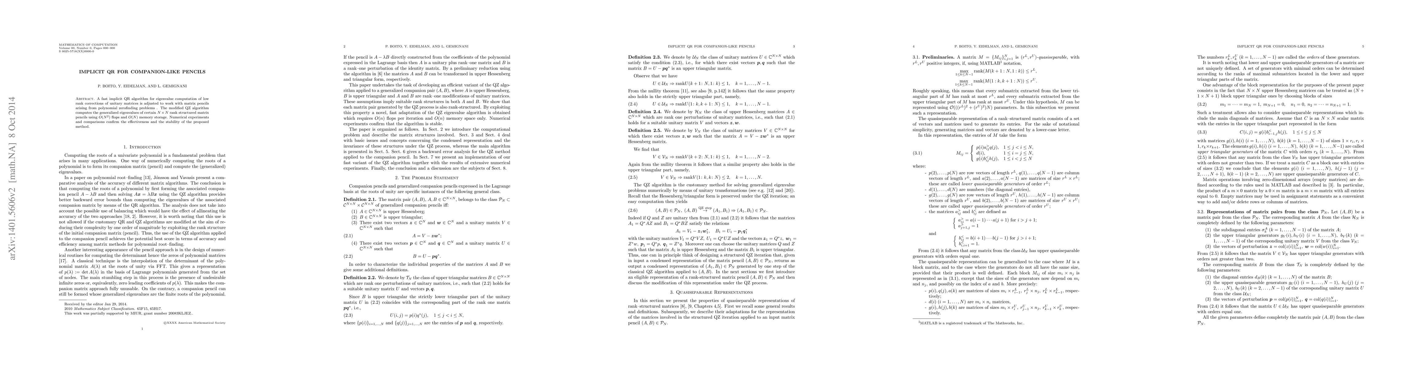 This paper proposes an efficient implicit QR algorithm for computing eigenvalues of low-rank corrections in unitary matrices, adapted for matrix pencils from polynomial zero-finding problems. The modified QZ algorithm achieves O(N^2) operations and O(N) memory, confirmed by numerical experiments to be effective and stable.
