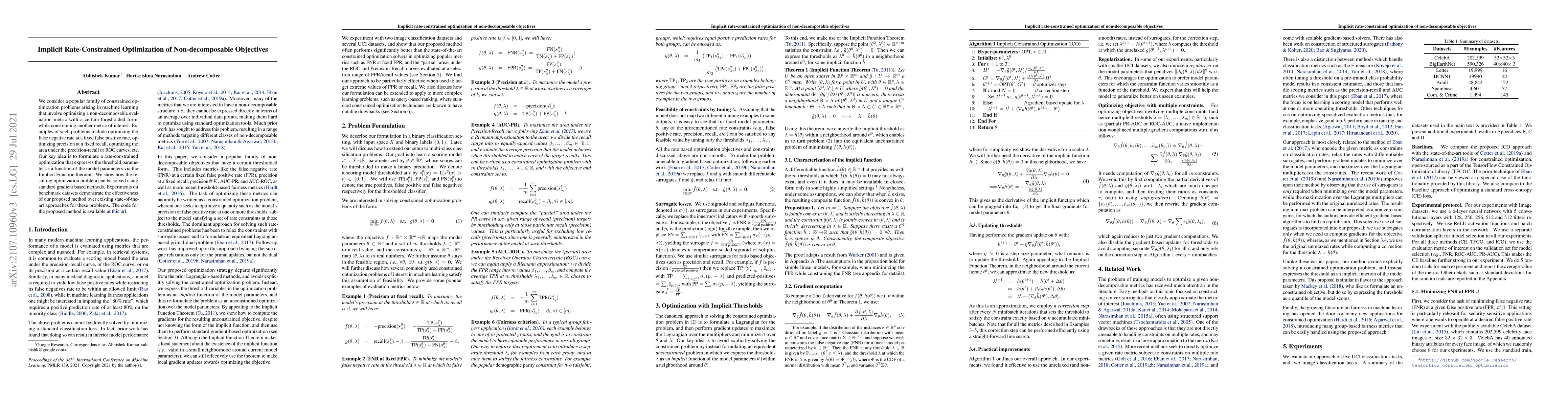 We consider a popular family of constrained optimization problems arising in machine learning that involve optimizing a non-decomposable evaluation metric with a certain thresholded form, while constraining another metric of interest. Examples of such problems include optimizing the false negative rate at a fixed false positive rate, optimizing precision at a fixed recall, optimizing the area under the precision-recall or ROC curves, etc. Our key idea is to formulate a rate-constrained optimization that expresses the threshold parameter as a function of the model parameters via the Implicit Function theorem. We show how the resulting optimization problem can be solved using standard gradient based methods. Experiments on benchmark datasets demonstrate the effectiveness of our proposed method over existing state-of-the art approaches for these problems. The code for the proposed method is available at https://github.com/google-research/google-research/tree/master/implicit_constrained_optimization .