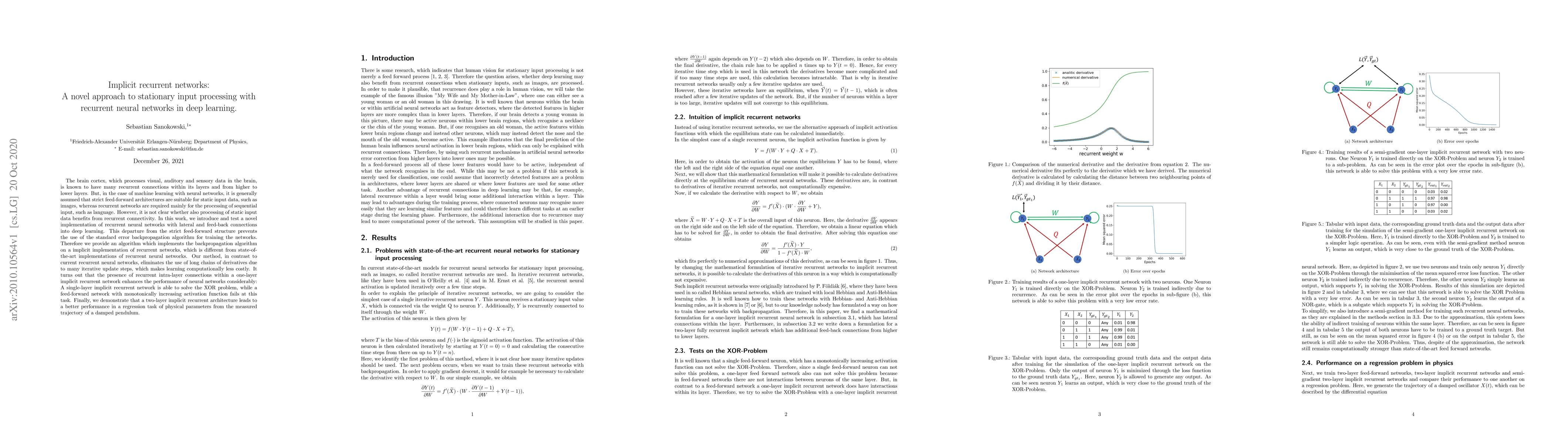 The brain cortex, which processes visual, auditory and sensory data in the brain, is known to have many recurrent connections within its layers and from higher to lower layers. But, in the case of machine learning with neural networks, it is generally assumed that strict feed-forward architectures are suitable for static input data, such as images, whereas recurrent networks are required mainly for the processing of sequential input, such as language. However, it is not clear whether also processing of static input data benefits from recurrent connectivity. In this work, we introduce and test a novel implementation of recurrent neural networks with lateral and feed-back connections into deep learning. This departure from the strict feed-forward structure prevents the use of the standard error backpropagation algorithm for training the networks. Therefore we provide an algorithm which implements the backpropagation algorithm on a implicit implementation of recurrent networks, which is different from state-of-the-art implementations of recurrent neural networks. Our method, in contrast to current recurrent neural networks, eliminates the use of long chains of derivatives due to many iterative update steps, which makes learning computationally less costly. It turns out that the presence of recurrent intra-layer connections within a one-layer implicit recurrent network enhances the performance of neural networks considerably: A single-layer implicit recurrent network is able to solve the XOR problem, while a feed-forward network with monotonically increasing activation function fails at this task. Finally, we demonstrate that a two-layer implicit recurrent architecture leads to a better performance in a regression task of physical parameters from the measured trajectory of a damped pendulum.