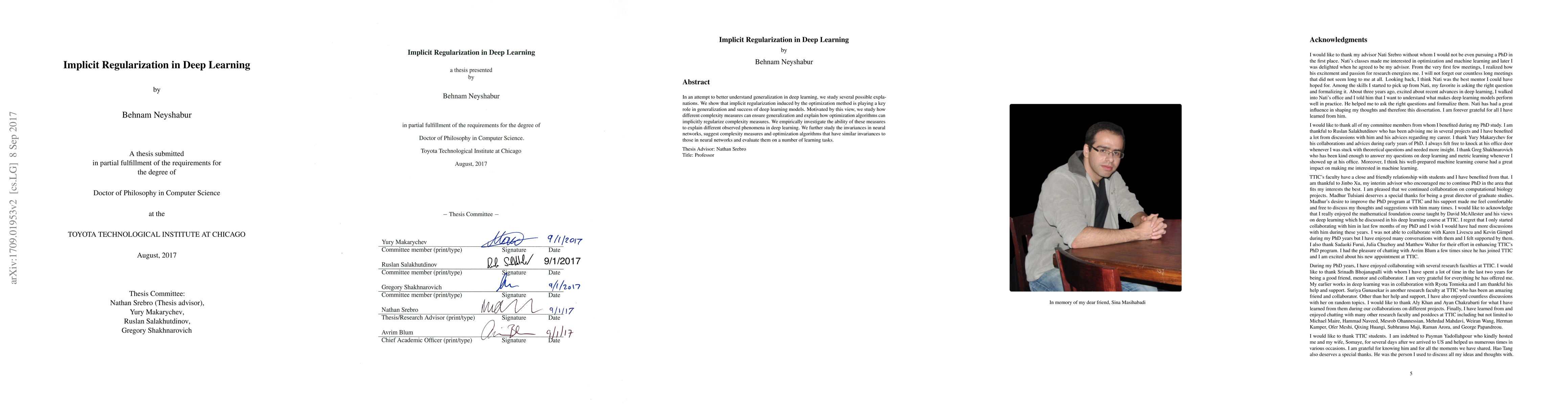This paper investigates how implicit regularization from optimization methods contributes to the generalization success of deep learning models. It explores various complexity measures and optimization algorithms that can implicitly regularize these measures, and evaluates their effectiveness in explaining observed phenomena and achieving invariances in neural networks.