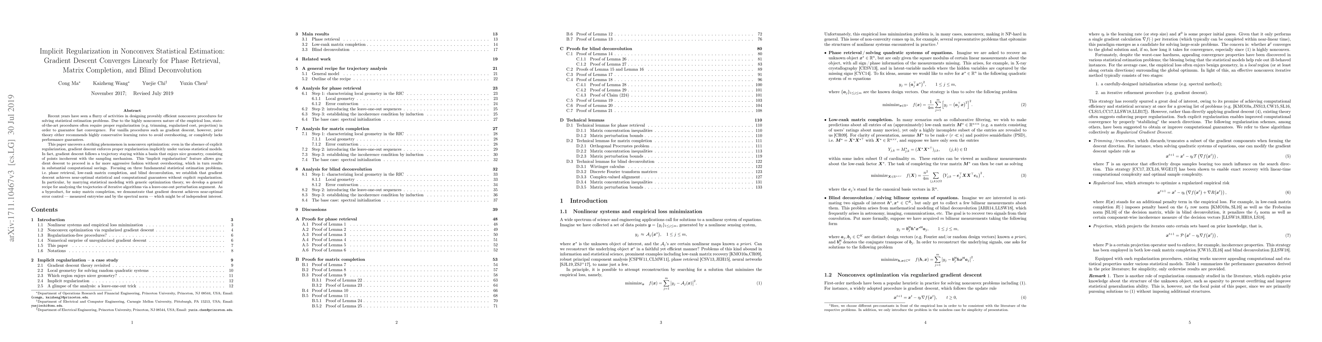 This paper reveals that gradient descent implicitly regularizes nonconvex optimization problems like phase retrieval, matrix completion, and blind deconvolution, leading to linear convergence without explicit regularization. By analyzing the algorithm's trajectory, the authors show that gradient descent achieves near-optimal statistical and computational performance.