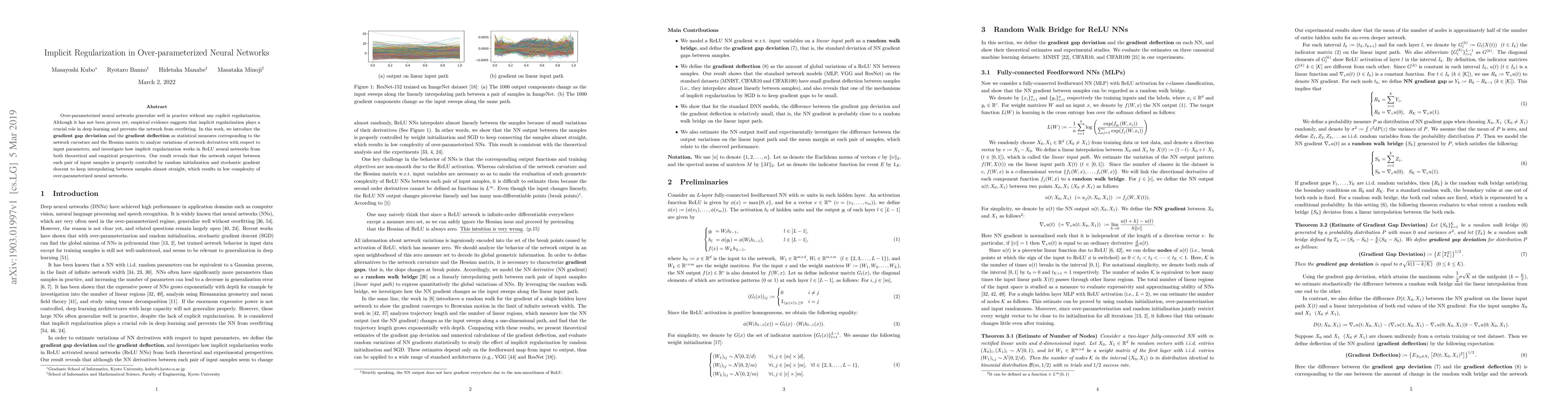 This paper investigates implicit regularization in over-parameterized neural networks, proposing gradient gap deviation and gradient deflection as measures to analyze network curvature and Hessian matrix. It finds that random initialization and stochastic gradient descent maintain low complexity by keeping network outputs straight between input samples, suggesting implicit regularization prevents overfitting.