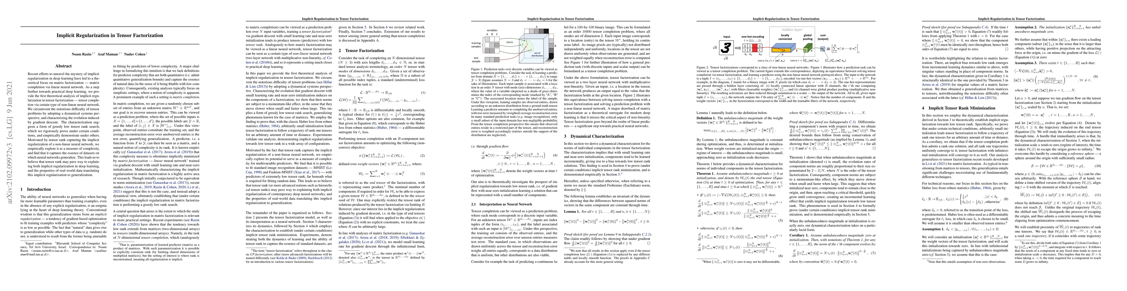 This paper investigates implicit regularization in tensor factorization through tensor completion using non-linear neural networks, offering a dynamical systems perspective to characterize gradient descent's evolution. It finds tensor rank to be a key measure of complexity that correlates with neural network generalization, suggesting it may explain implicit regularization in deep learning and data properties aiding generalization.