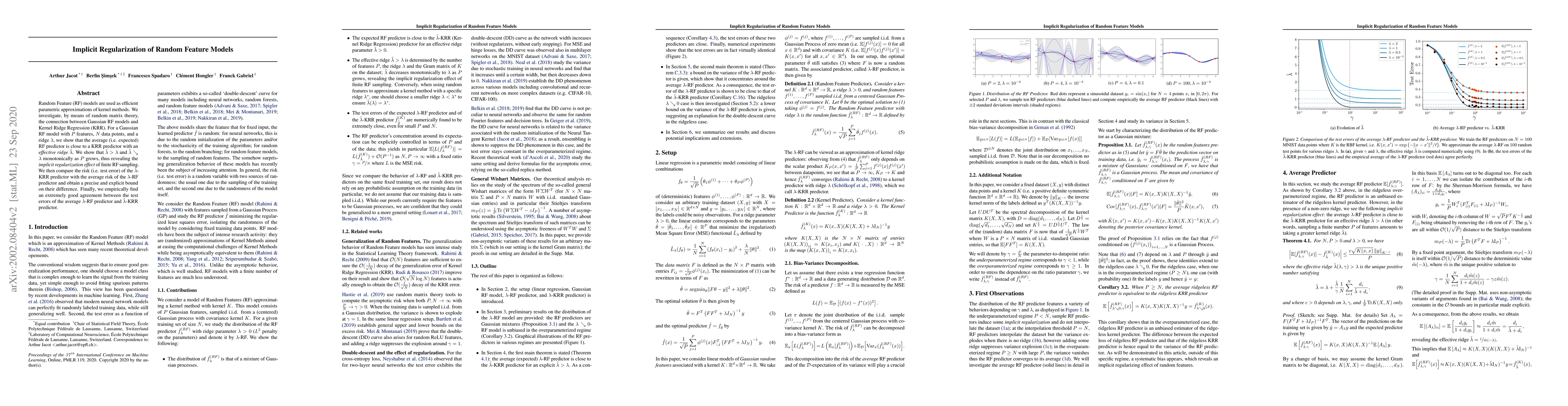 This paper uses random matrix theory to demonstrate that Gaussian Random Feature models implicitly regularize Kernel Ridge Regression, with an effective ridge parameter $\tilde{\lambda}$ that exceeds the original $\lambda$ and approaches it as the number of features $P$ increases. Empirical results show strong agreement between the test errors of the average RF predictor and the KRR predictor with the effective regularization parameter.