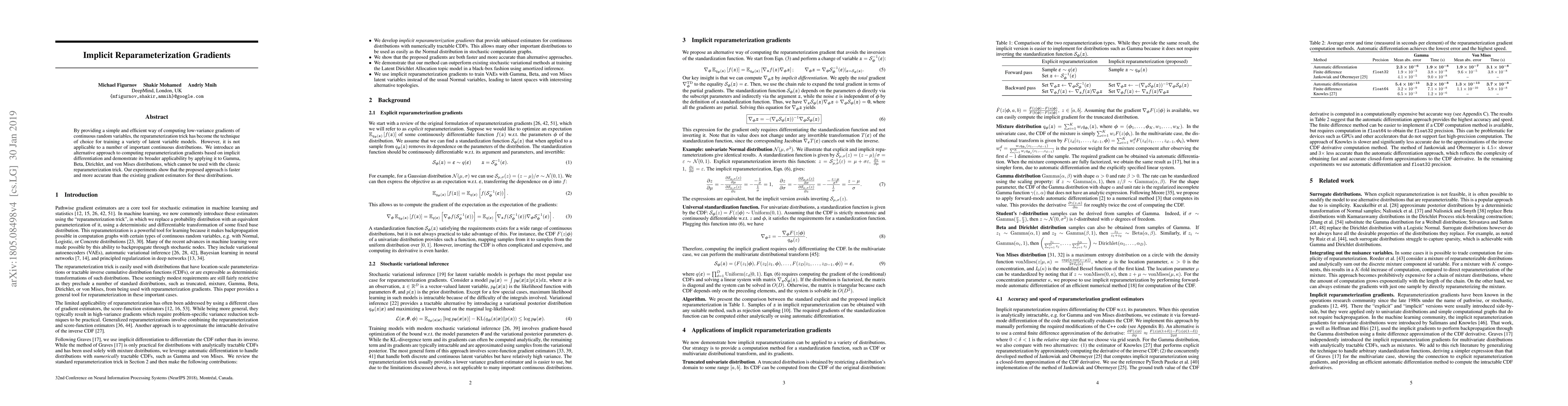 This paper introduces an alternative method for computing reparameterization gradients using implicit differentiation, which is applicable to continuous distributions like Gamma, Beta, Dirichlet, and von Mises that cannot use the classic reparameterization trick. The proposed approach is shown to be faster and more accurate than existing gradient estimators.