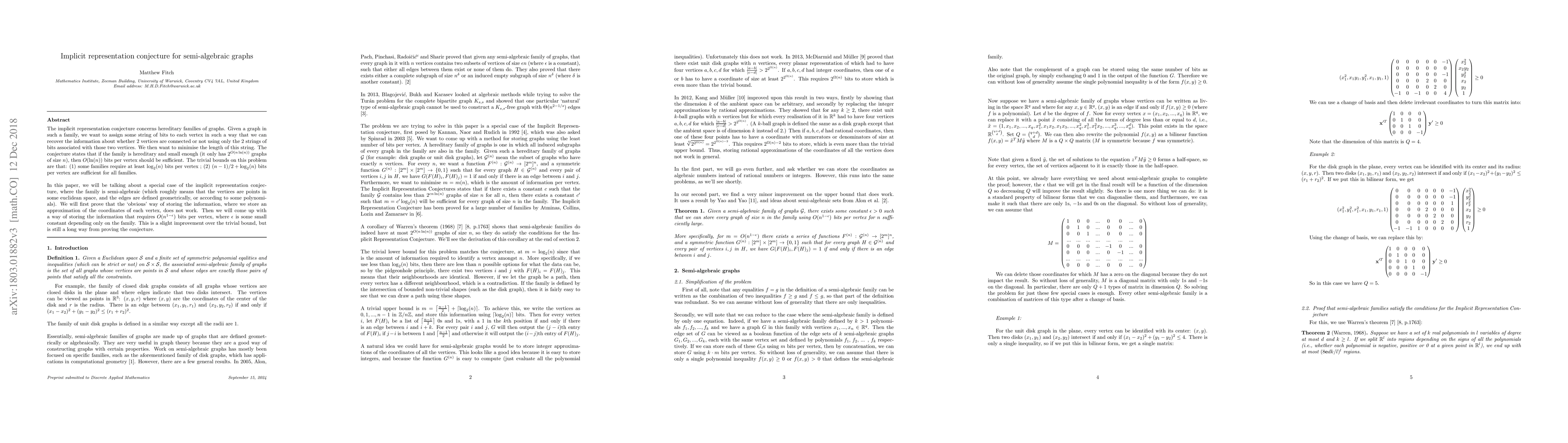 The implicit representation conjecture concerns hereditary families of graphs. Given a graph in such a family, we want to assign some string of bits to each vertex in such a way that we can recover the information about whether 2 vertices are connected or not using only the 2 strings of bits associated with those two vertices. We then want to minimise the length of this string. The conjecture states that if the family is hereditary and small enough (it only has $2^{O(n\ln(n))}$ graphs of size $n$), then $O(\ln(n))$ bits per vertex should be sufficient. The trivial bounds on this problem are that: (1) some families require at least $\ln_2(n)$ bits per vertex ; (2) $(n-1)/2+\ln_2(n)$ bits per vertex are sufficient for all families. In this paper, we will be talking about a special case of the implicit representation conjecture, where the family is semi-algebraic (which roughly means that the vertices are points in some euclidean space, and the edges are defined geometrically, or according to some polynomials). We will first prove that the `obvious' way of storing the information, where we store an approximation of the coordinates of each vertex, doesn't work. Then we will come up with a way of storing the information that requires $O(n^{1-\epsilon})$ bits per vertex, where $\epsilon$ is some small constant depending only on the family. This is a slight improvement over the trivial bound, but is still a long way from proving the conjecture.