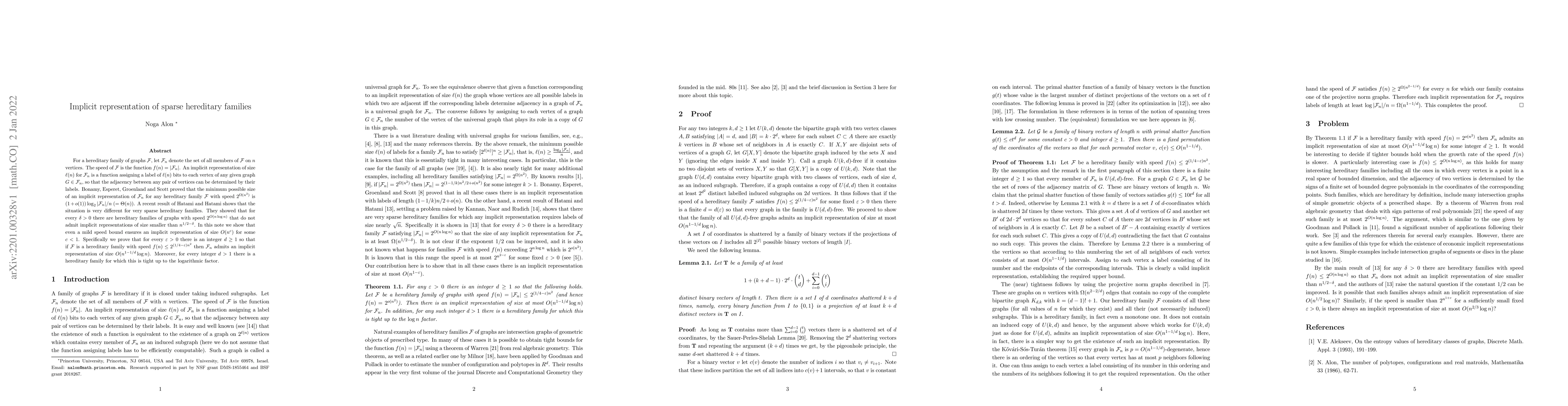 This paper investigates the implicit representation of sparse hereditary families of graphs, demonstrating that a mild speed bound ensures an implicit representation of size $O(n^c)$ for some $c<1$. Specifically, it shows that for any hereditary family $\FF$ with speed $f(n) \leq 2^{(1/4-\eps)n^2}$, an implicit representation of size $O(n^{1-1/d} \log n)$ exists, where $d$ is an integer greater than or equal to 1.
