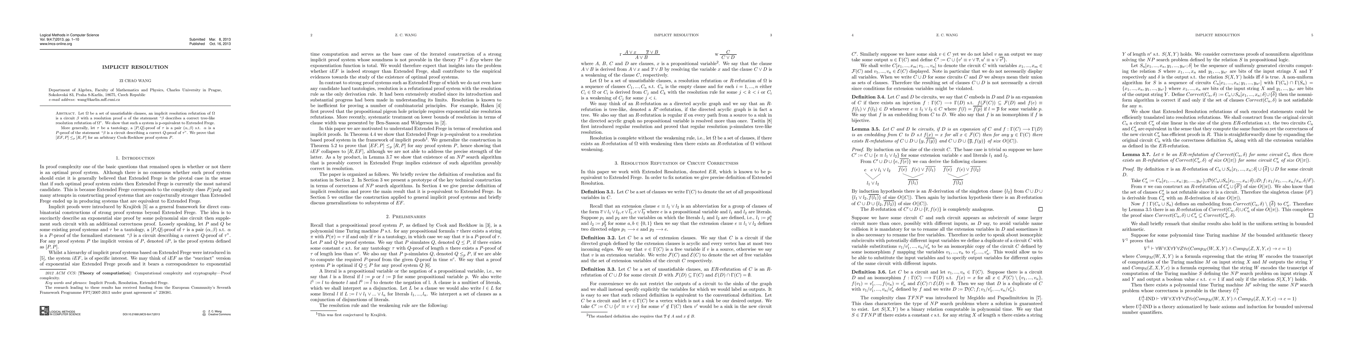 Let \Omega be a set of unsatisfiable clauses, an implicit resolution refutation of \Omega is a circuit \beta with a resolution proof {\alpha} of the statement "\beta describes a correct tree-like resolution refutation of \Omega". We show that such system is p-equivalent to Extended Frege. More generally, let {\tau} be a tautology, a [P, Q]-proof of {\tau} is a pair (\alpha,\beta) s.t. \alpha is a P-proof of the statement "\beta is a circuit describing a correct Q-proof of \tau". We prove that [EF,P] \leq p [R,P] for arbitrary Cook-Reckhow proof system P.