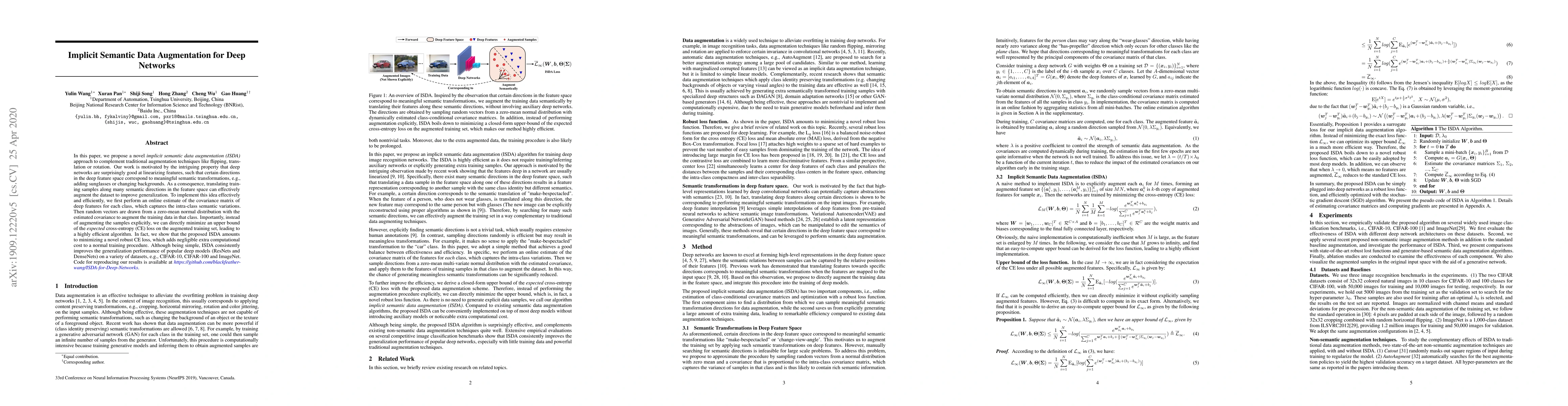 This paper introduces a novel implicit semantic data augmentation (ISDA) method that enhances deep networks' generalization by translating training samples along meaningful semantic directions in the feature space. The approach efficiently augments data by minimizing an upper bound of the cross-entropy loss, consistently improving performance on datasets like CIFAR-10 and ImageNet.