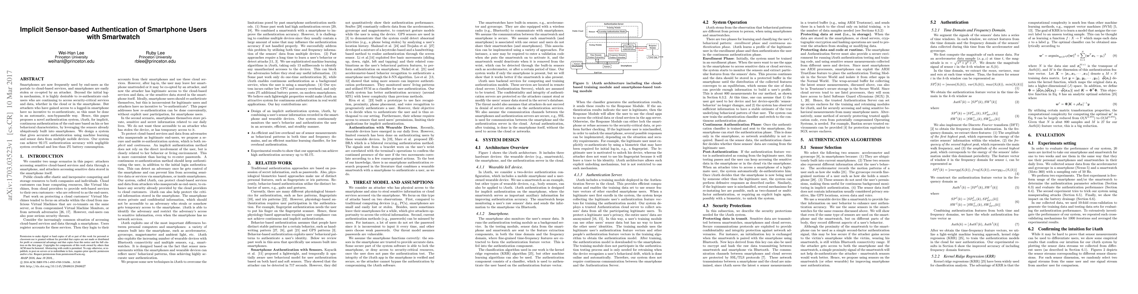 This paper introduces iAuth, a novel implicit sensor-based authentication system for continuous verification of smartphone users using their behavioral characteristics and machine learning. The system leverages sensors in smartphones and smartwatches, achieving 92.1% accuracy with minimal system overhead and low battery consumption.