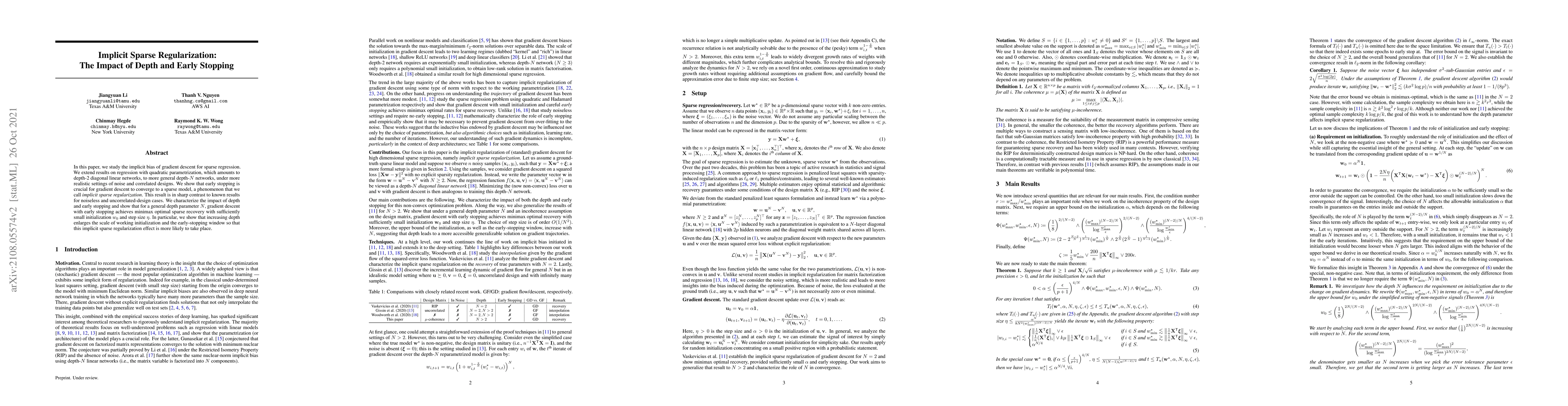This paper investigates the implicit sparse regularization effect of gradient descent in deep networks, demonstrating that early stopping is essential for sparse model convergence. It shows that increasing network depth enhances the likelihood of this effect, achieving optimal sparse recovery under realistic noise and correlated design conditions.