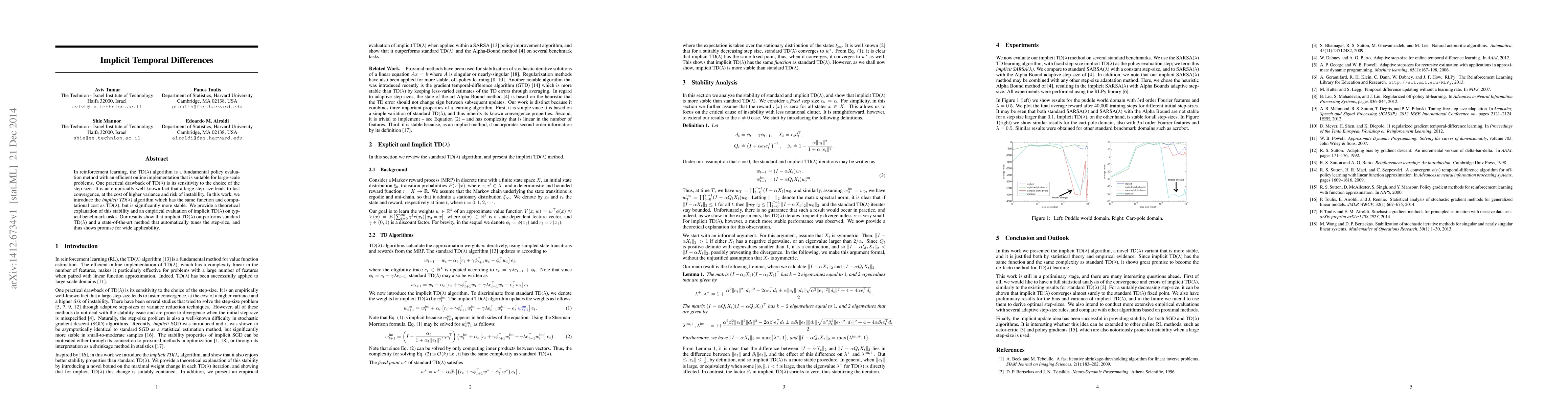 In reinforcement learning, the TD($\lambda$) algorithm is a fundamental policy evaluation method with an efficient online implementation that is suitable for large-scale problems. One practical drawback of TD($\lambda$) is its sensitivity to the choice of the step-size. It is an empirically well-known fact that a large step-size leads to fast convergence, at the cost of higher variance and risk of instability. In this work, we introduce the implicit TD($\lambda$) algorithm which has the same function and computational cost as TD($\lambda$), but is significantly more stable. We provide a theoretical explanation of this stability and an empirical evaluation of implicit TD($\lambda$) on typical benchmark tasks. Our results show that implicit TD($\lambda$) outperforms standard TD($\lambda$) and a state-of-the-art method that automatically tunes the step-size, and thus shows promise for wide applicability.